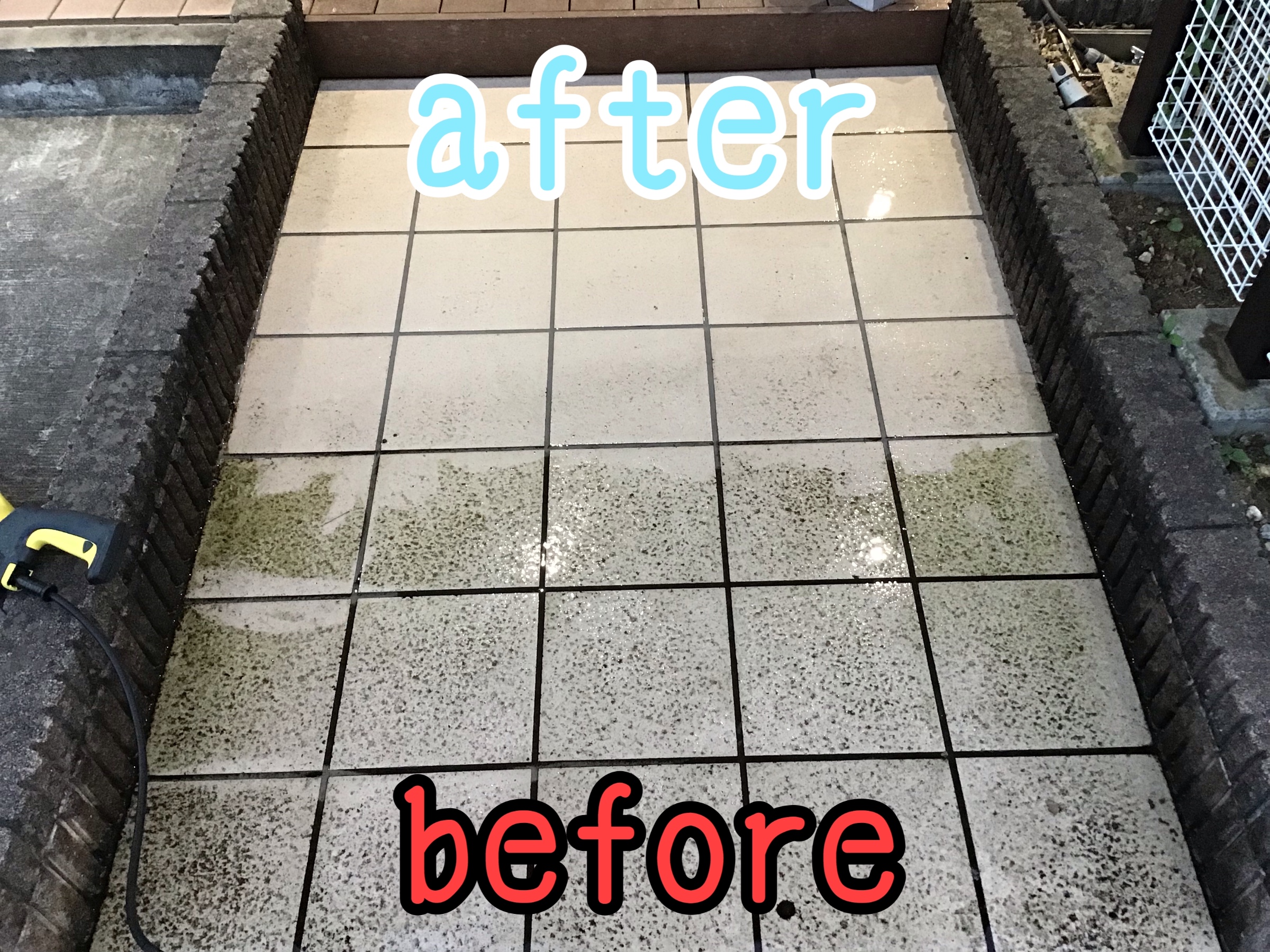 ついでにウッドデッキ側のタイルも汚れていたため、高圧洗浄機で掃除すると、、、。