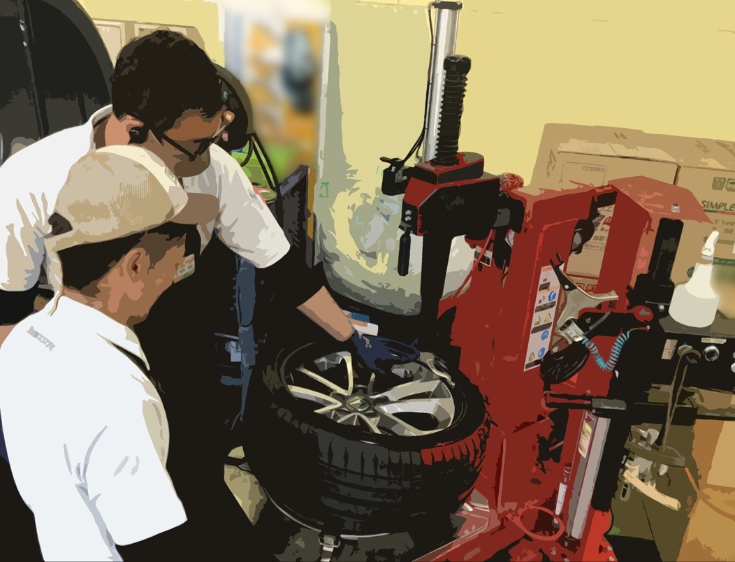 そこにはタイヤの組替作業を練習する髙野スタッフの姿が・・・