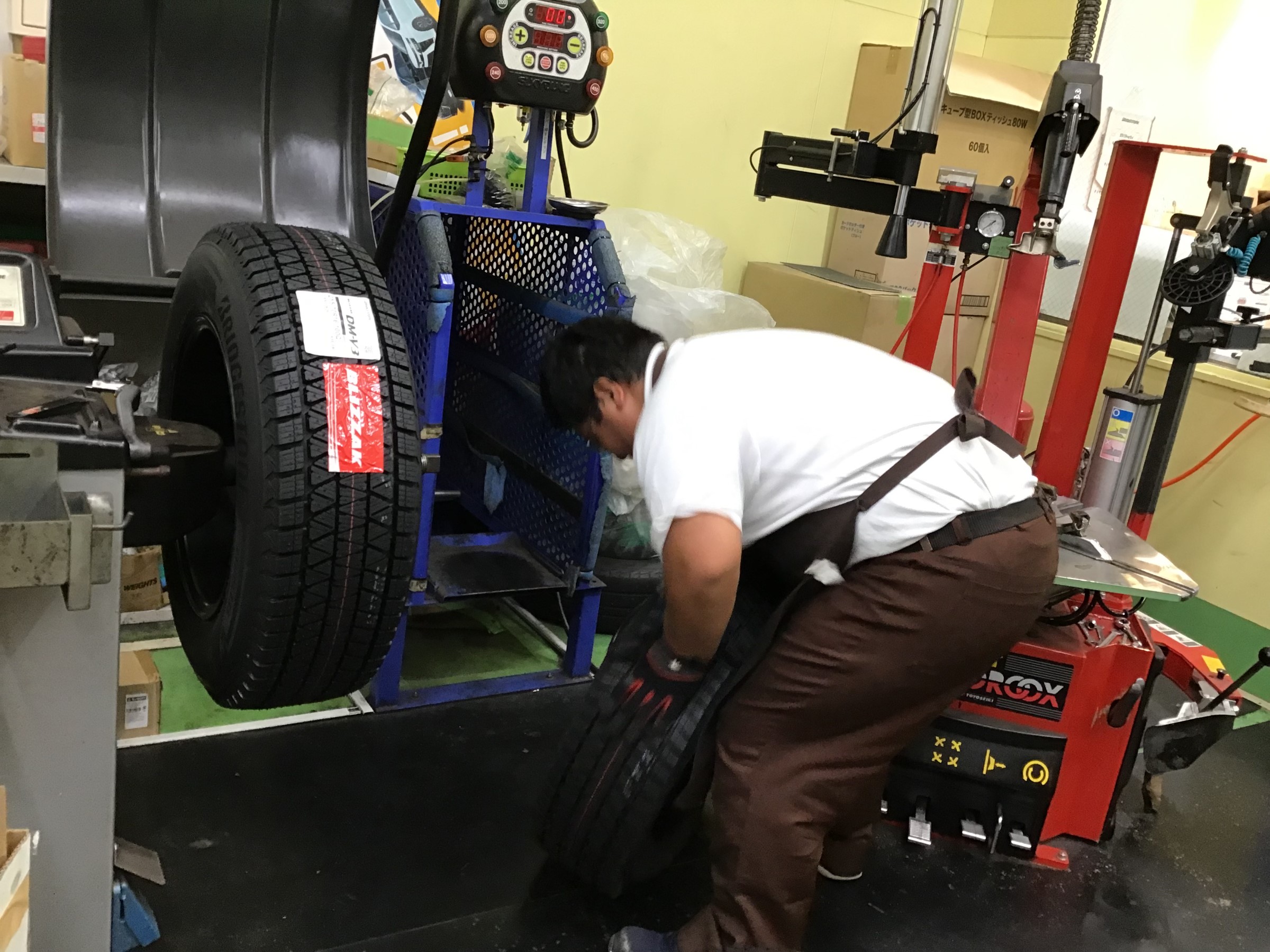 気合の腕まくりでたくさんのタイヤを組み付けています。