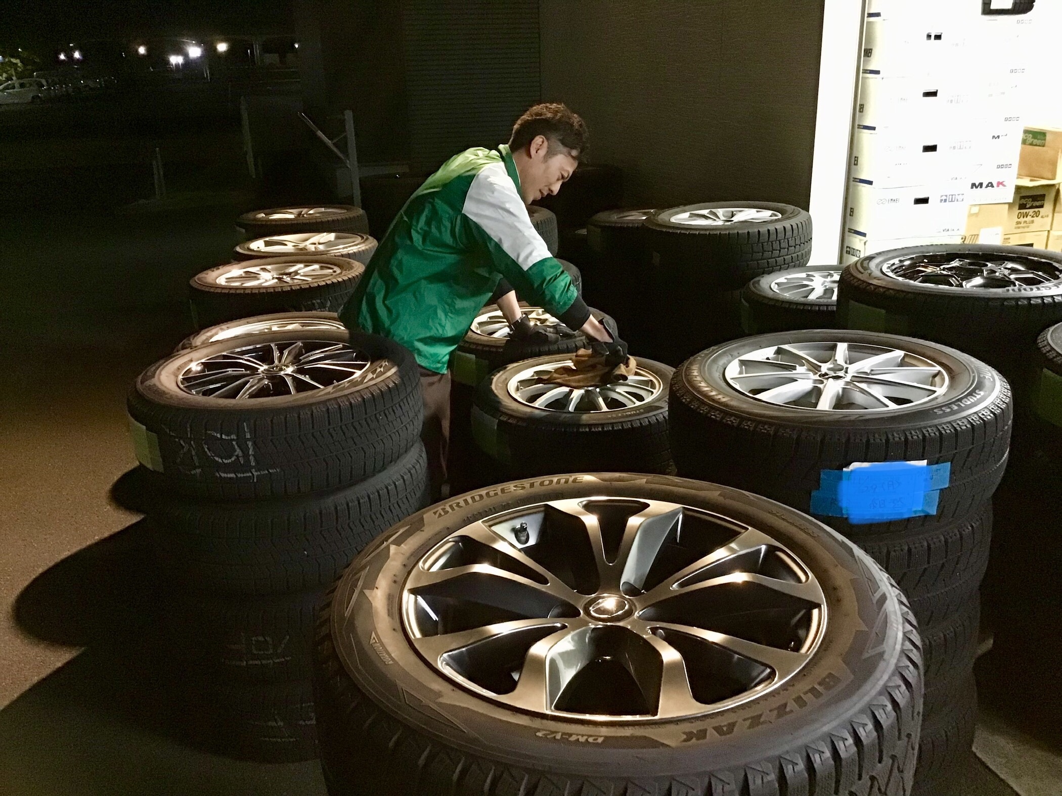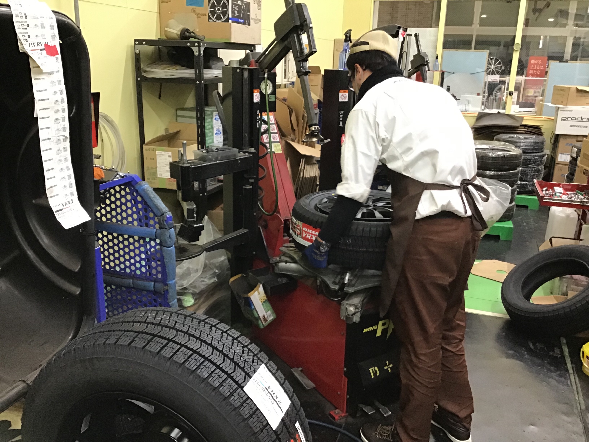 しかし、このように青柳スタッフが、必要最低限のスペースで予約分のスタッドレスタイヤの準備をしています٩( 'ω' )و