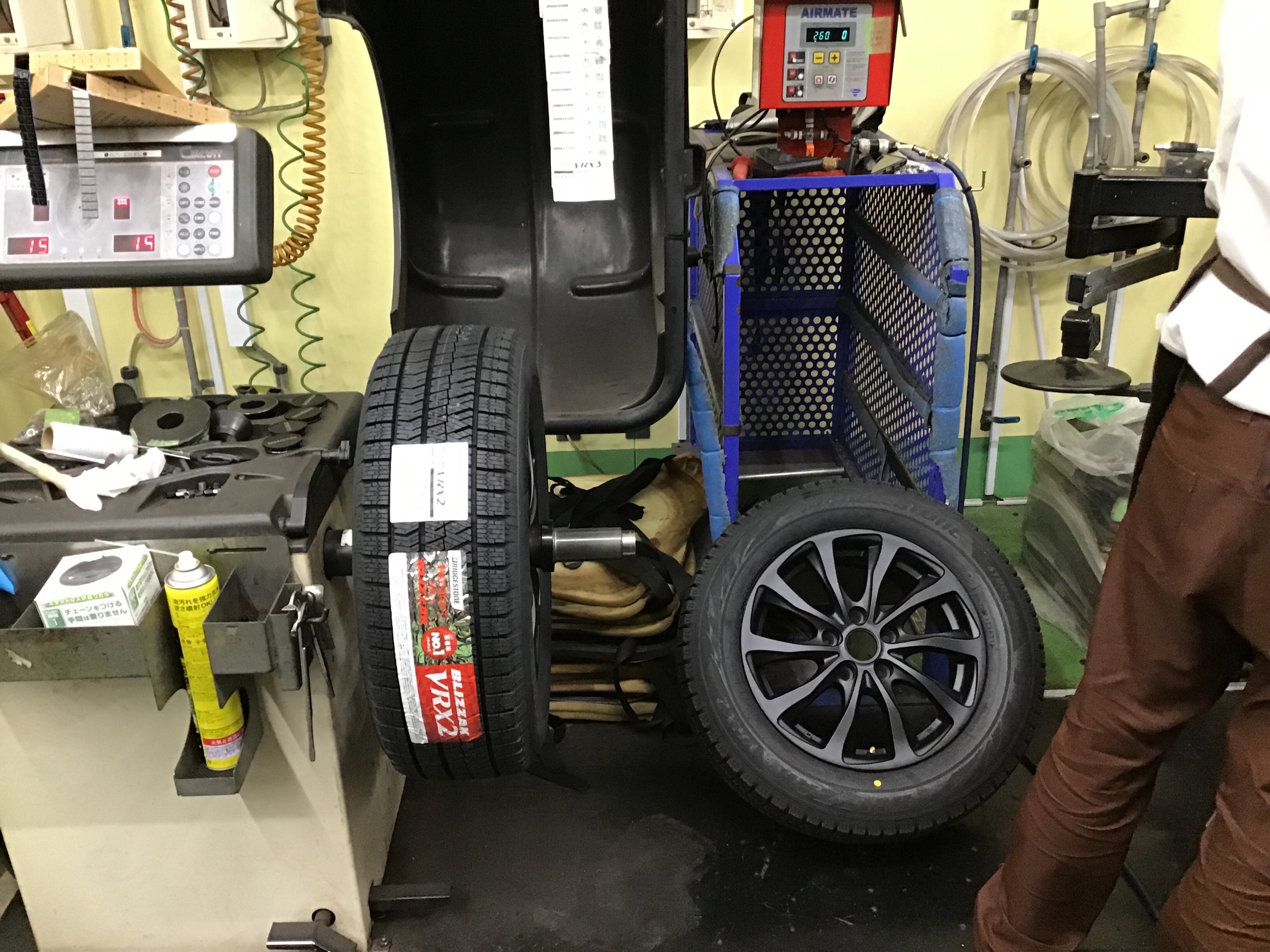 青柳スタッフがタイヤを組んでいる合間に、私は外でお客様のホイールを拭き上げしています(^◇^;)