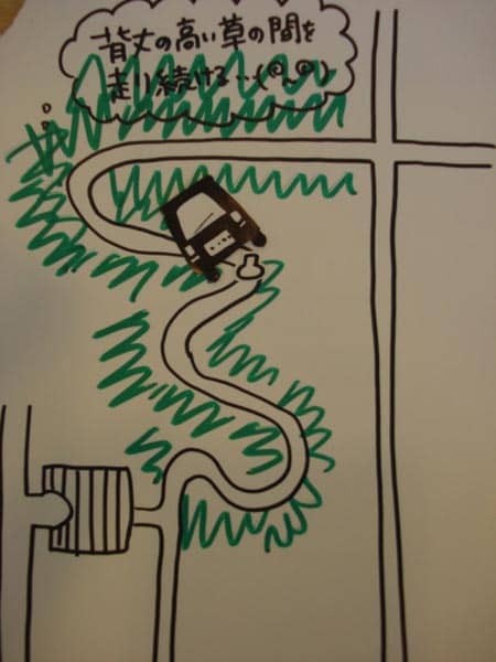 背丈の高い草の中を走る細い道が続いており、引き返すことも転回することもできないまま、