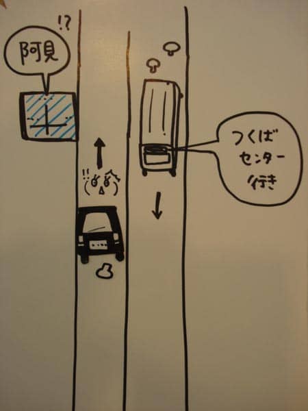 しかも「対向」車線を走る路線バスが「つくばセンター行き」