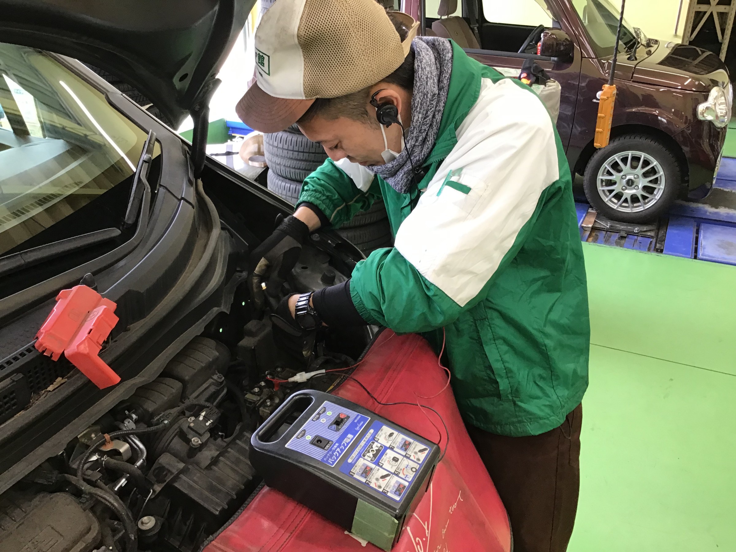 バッテリーのバックアップ電源を繋ぎ、安全にバッテリーを取り外していきます。