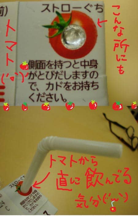 早速いただこうとしたら、ストローぐちにまでトマトが・・・。