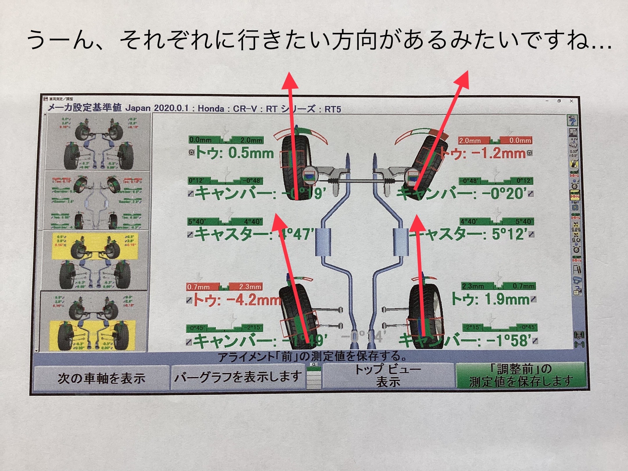 今回のCR-Vで調整可能なのは前後輪の「トー角」と言われる数値になります。