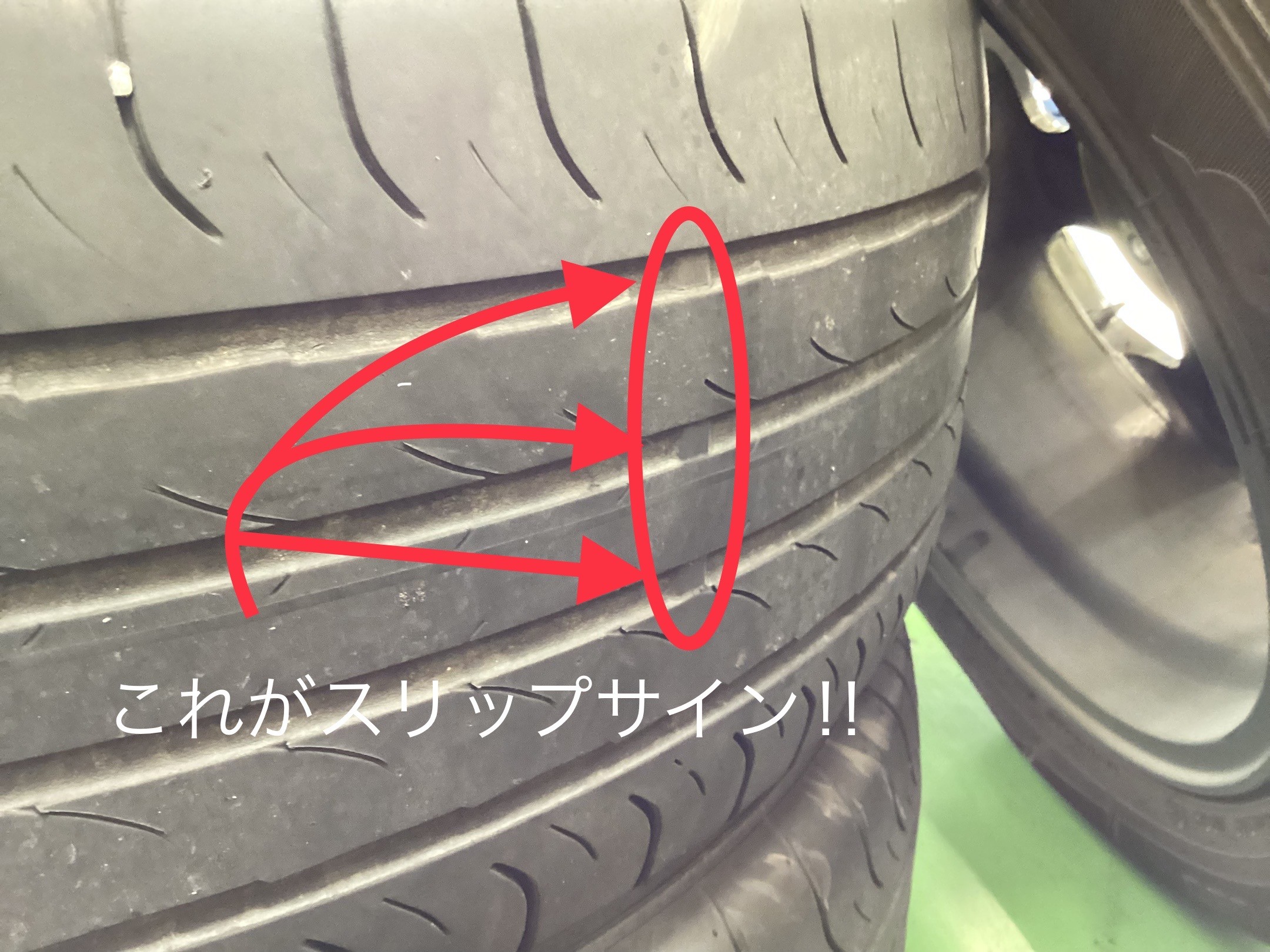 スリップサインと呼ばれる「タイヤの使用限度」が露出してきています。