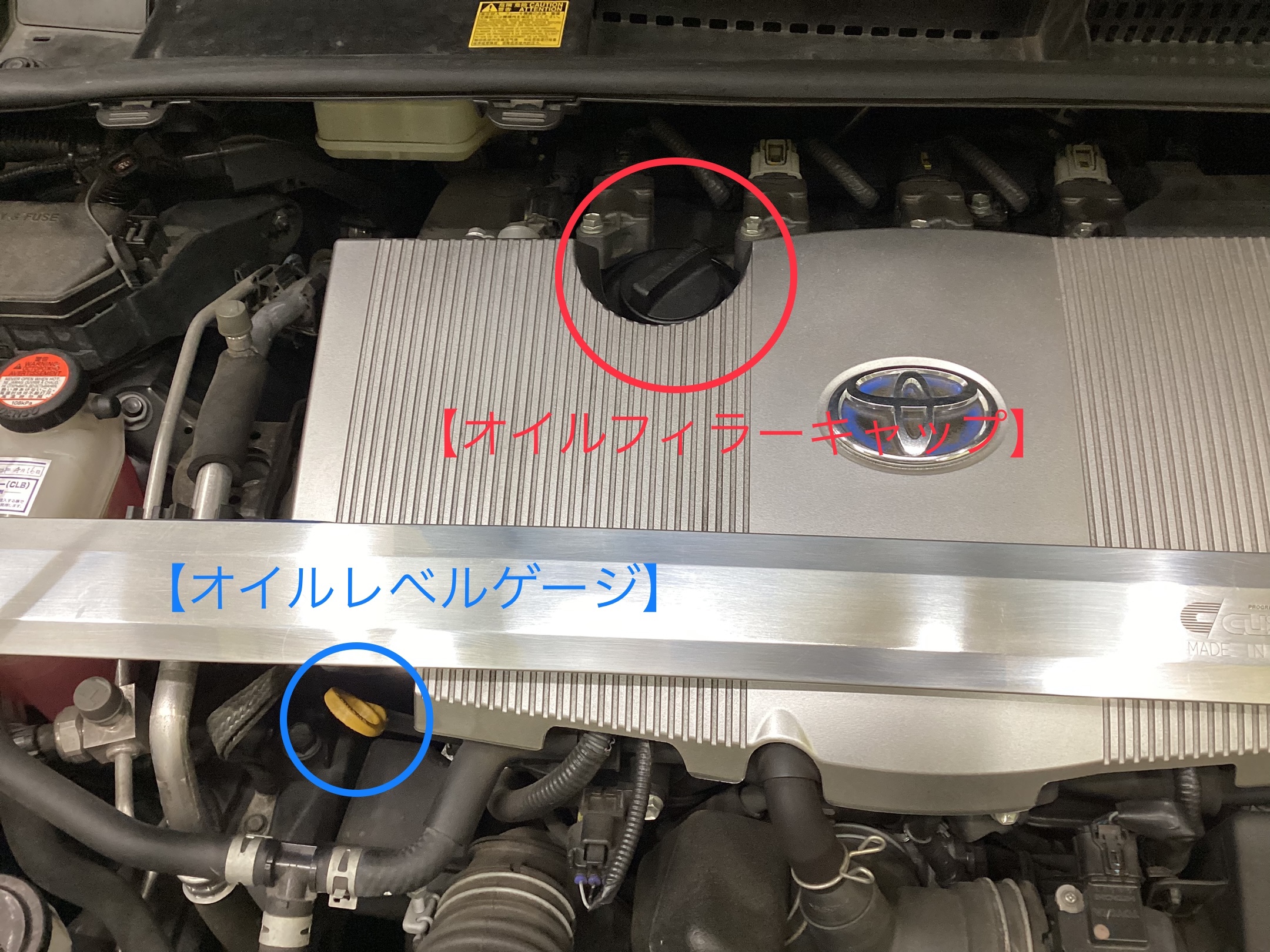 青い〇で囲んであるのが、オイルレベルゲージといい、オイルがどのくらい入っているのか確認できるゲージになっています(^^)/