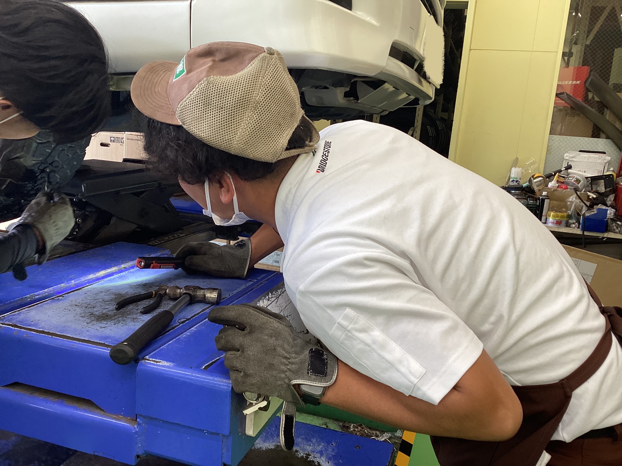 西山スタッフも何が刺さってパンクしているのか気になってライトの位置が定まらないのかな??