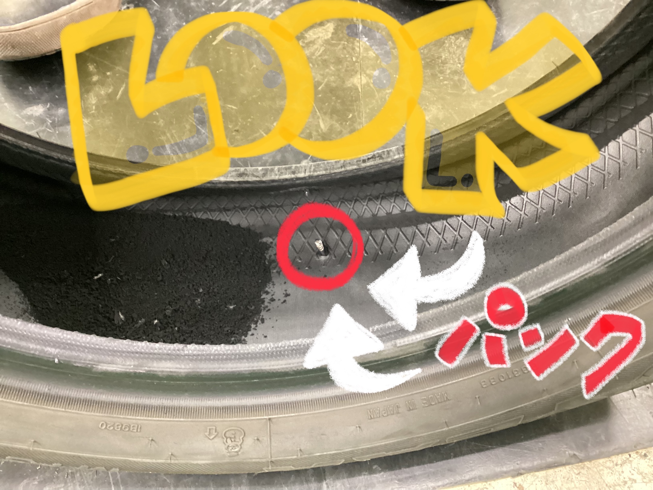 パンクしているのに走行してしまうとタイヤが削れてこのような粉が出てきます。