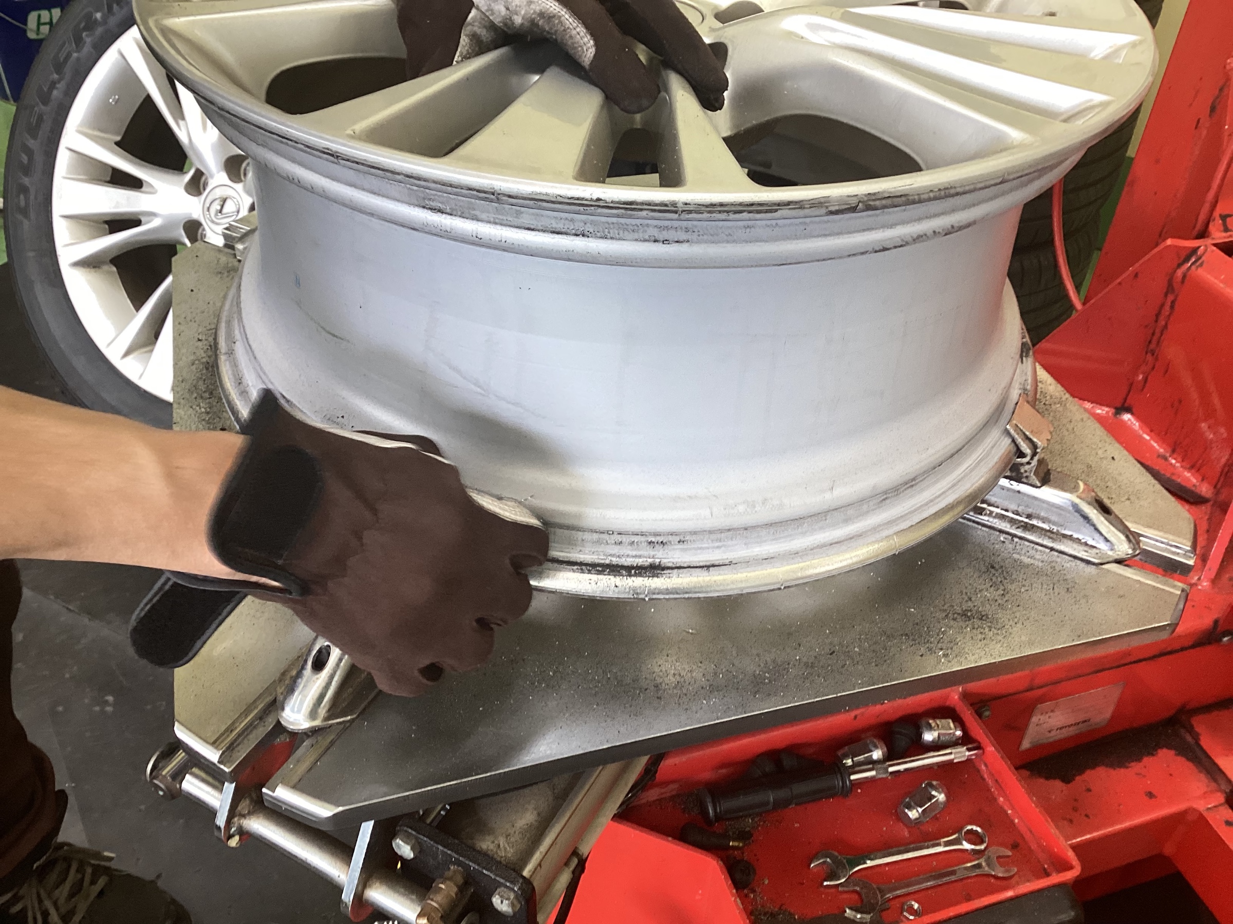 組み替えをする際に上の写真のようにホイールについている汚れを削っていきます(*^o^*)