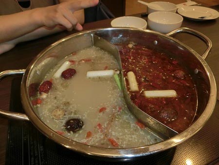 乳白色のスープが白湯スープ、赤色のスープが麻辣スープです。
