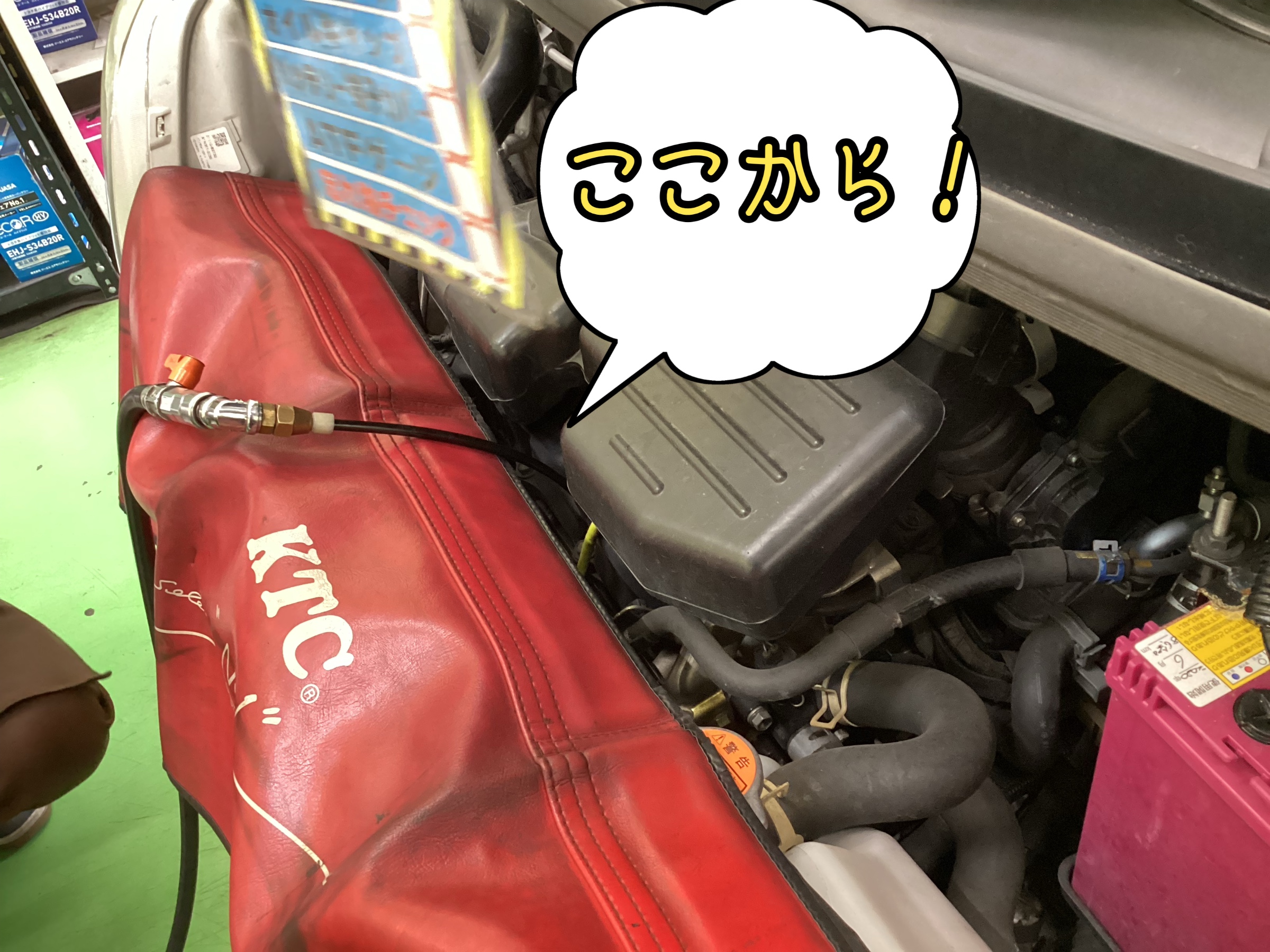 今回はエンジンオイルのみの交換のため、エンジンオイルレベルゲージ口から抜いていきます!