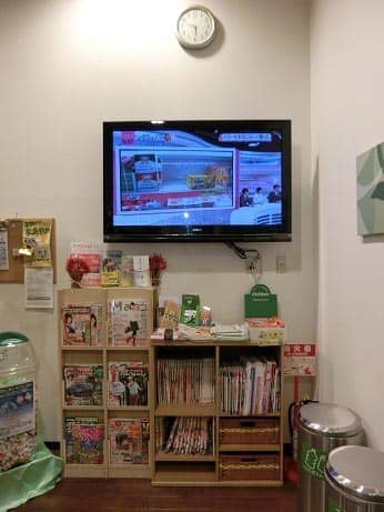 店内に入って頂くと、右手の奥に大きなテレビと雑誌コーナーがあります。