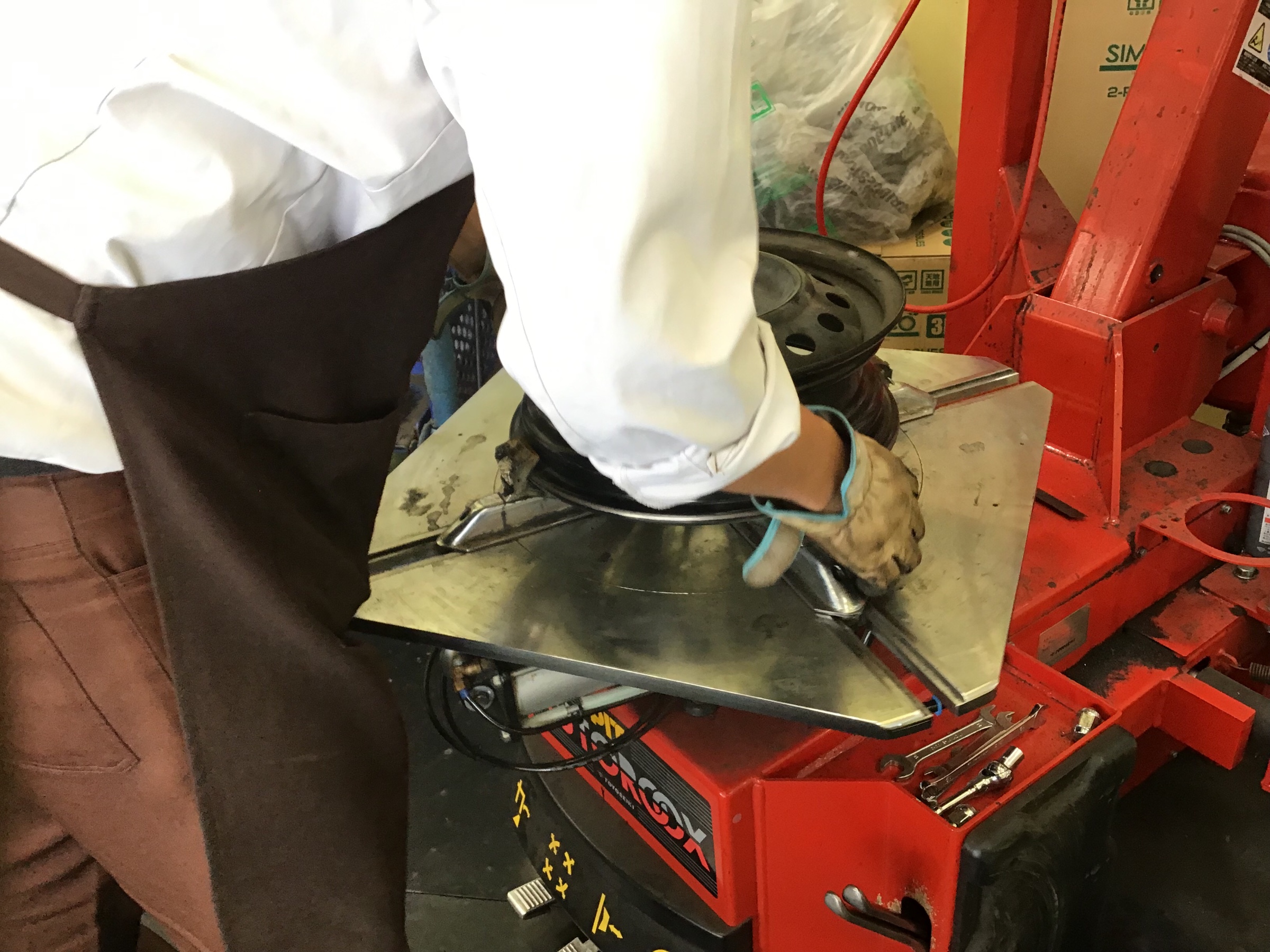 付いていたタイヤを剥がして、バルブを交換してタイヤカスを削っていきます!