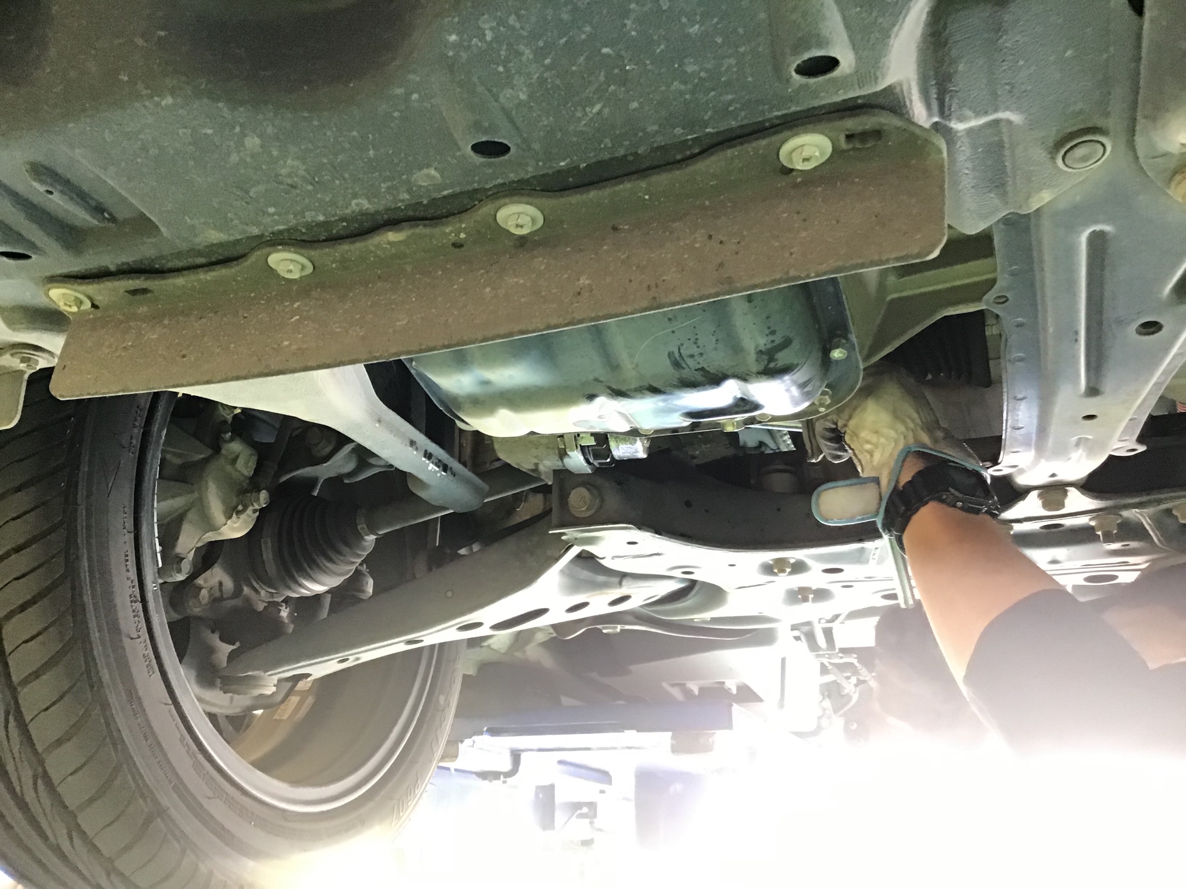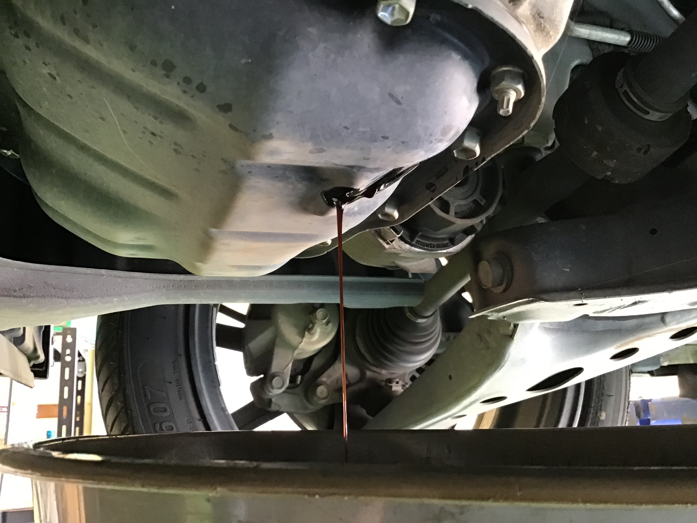 お車をリフトで上げて、ドレンボルトからオイルを抜きます。