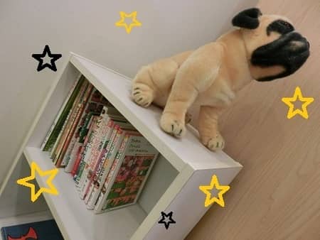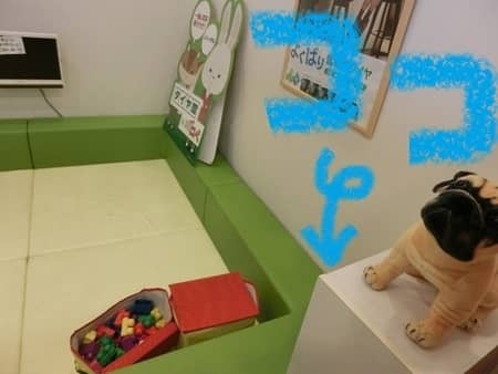 キッズスペースのワンコがいる所に本が入っていますので、