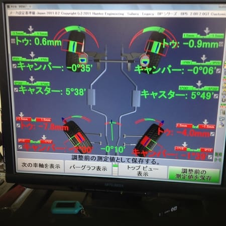 キャンバーもトゥーも完璧に戻りました!! この度はアライメント調整ありがとうございます!!