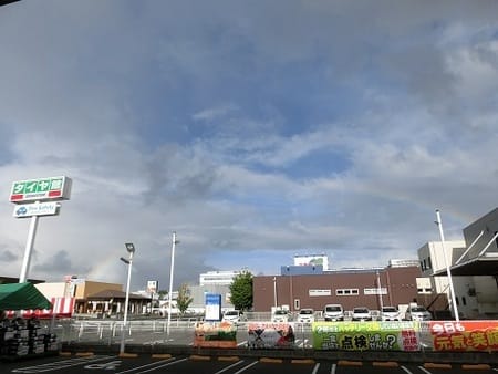 何を撮っているのかなーと思い、覗いてみると店舗の前に大きな虹が架かっていました。(画像2枚め)