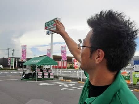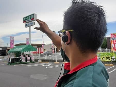 お題は、「タイヤ館看板にタッチ!」