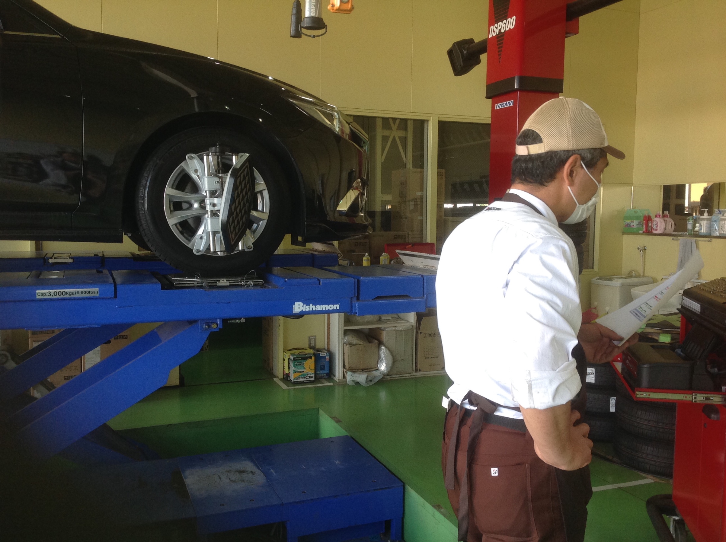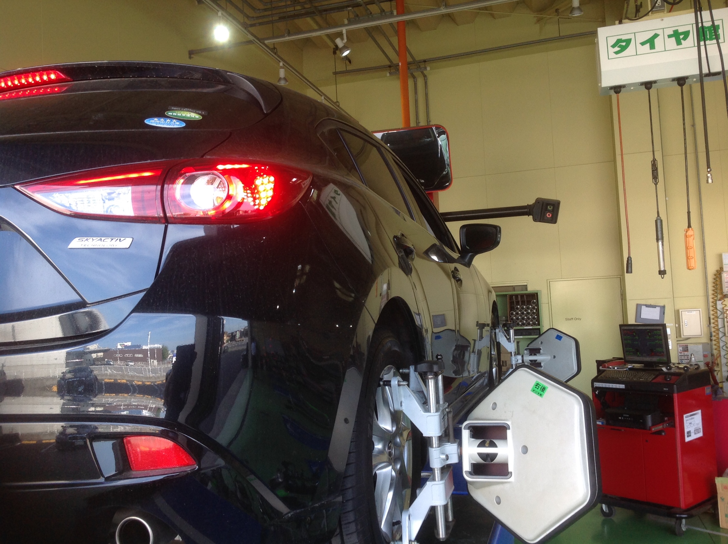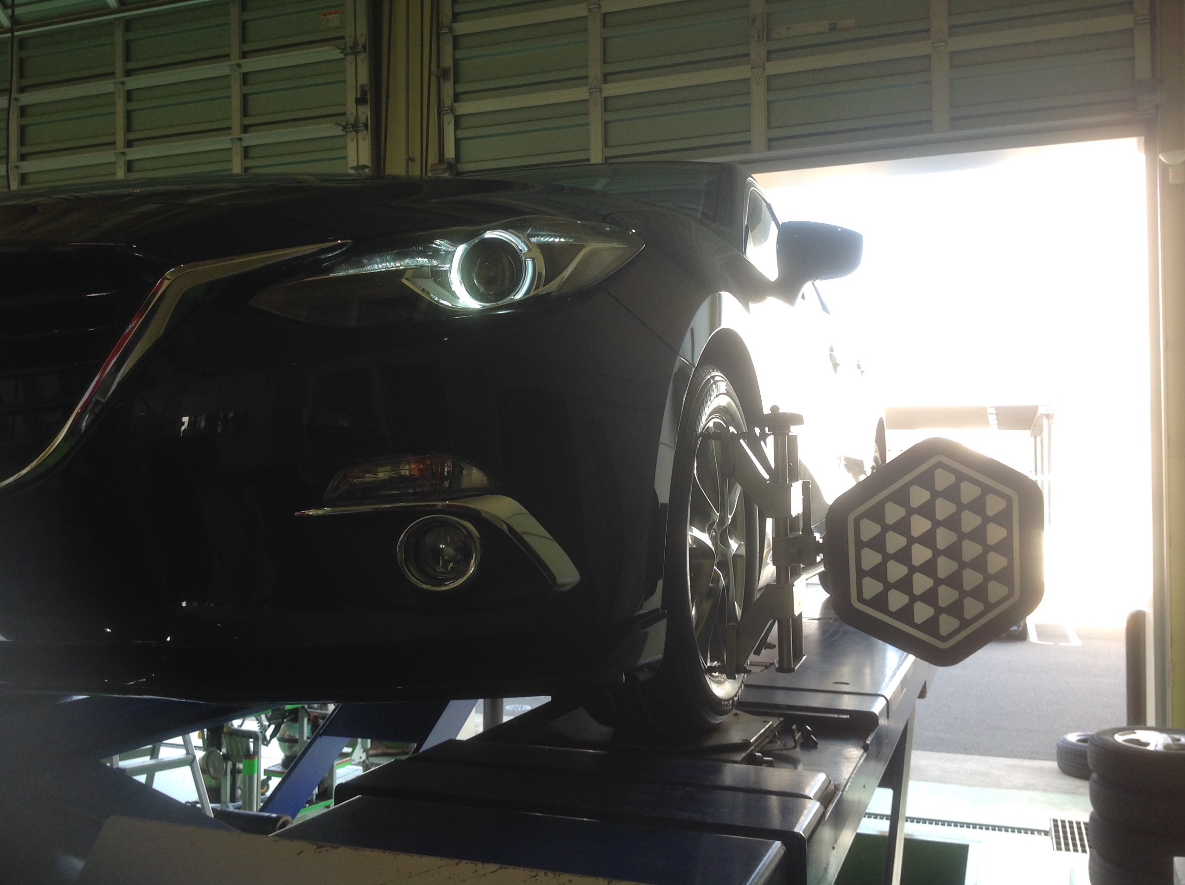 本日はパンクでお預かりしているアクセラのホイールアライメント作業をしています。
