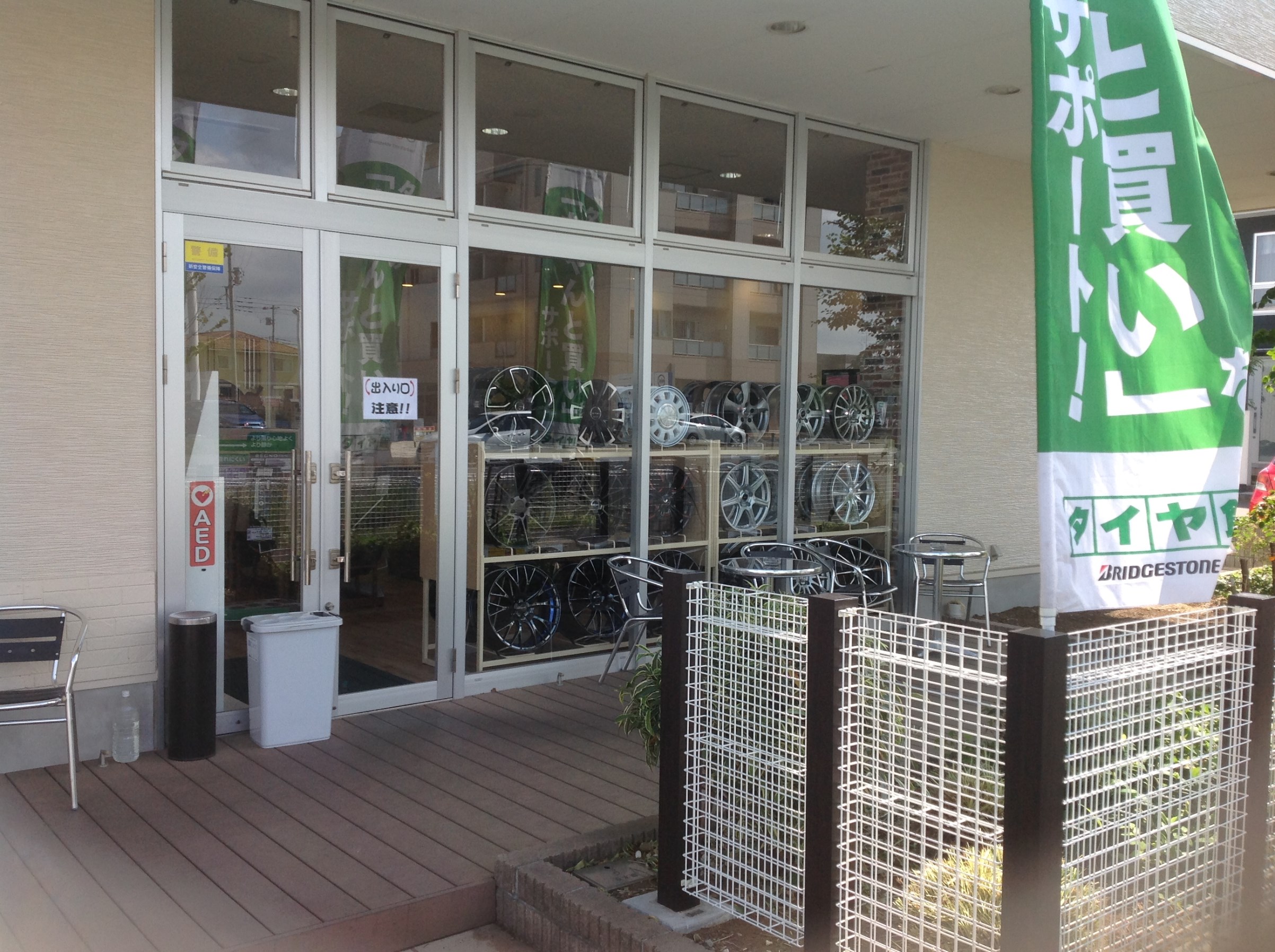 タイヤ館グリーンピットつくば研究学園店は歩行者の方にも、見て楽しんでいただけるように