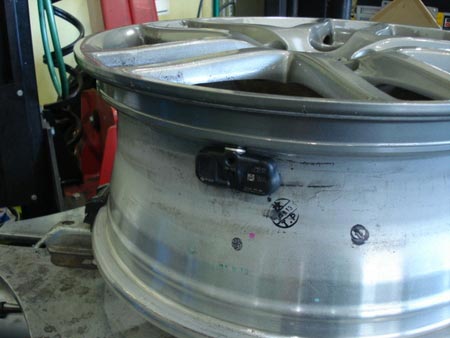 1)ホイールに送信機を取り付けて、タイヤを組み込みます。