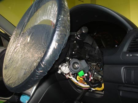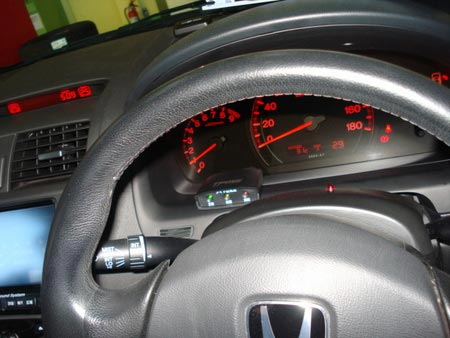 2)受信機を車内に取り付けます。今回は、運転席からでも見やすいメーター前に設置。電源はハンドル下から取りました。