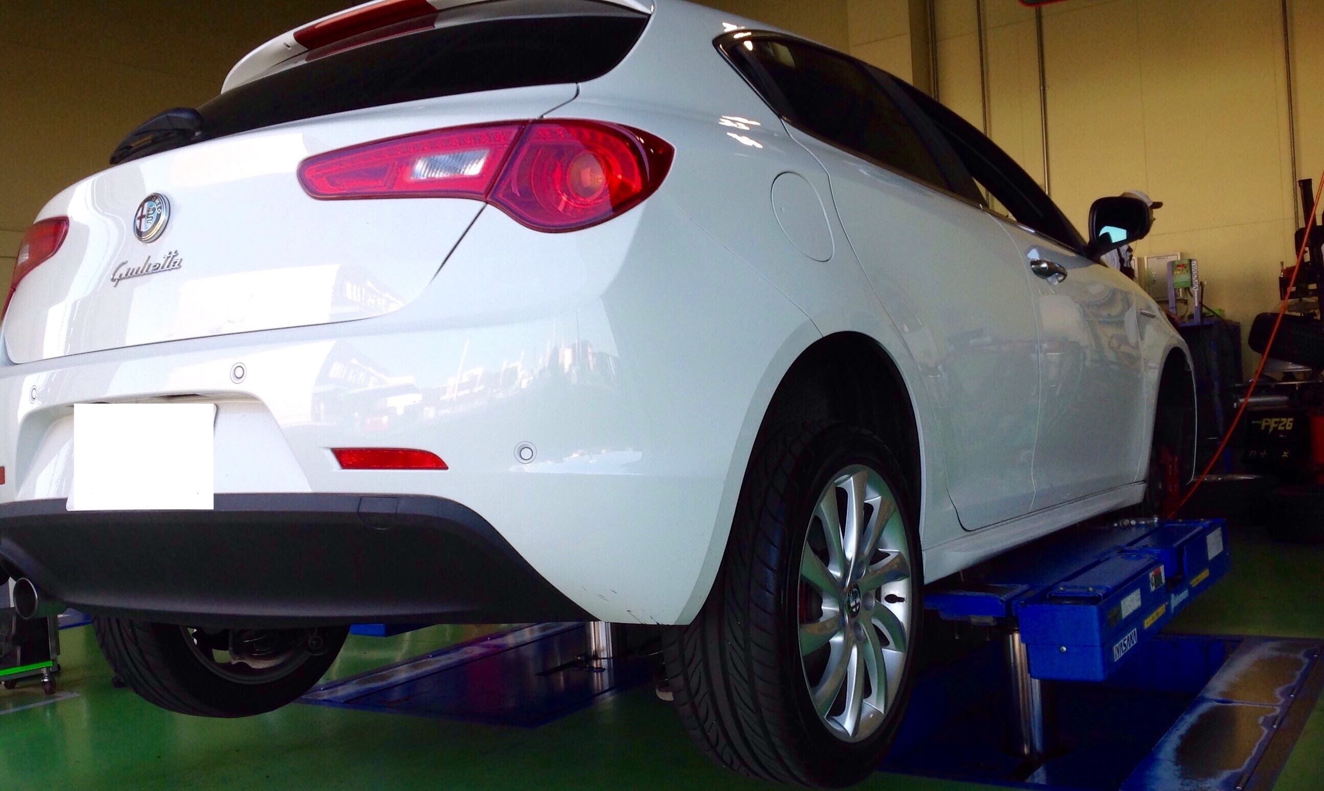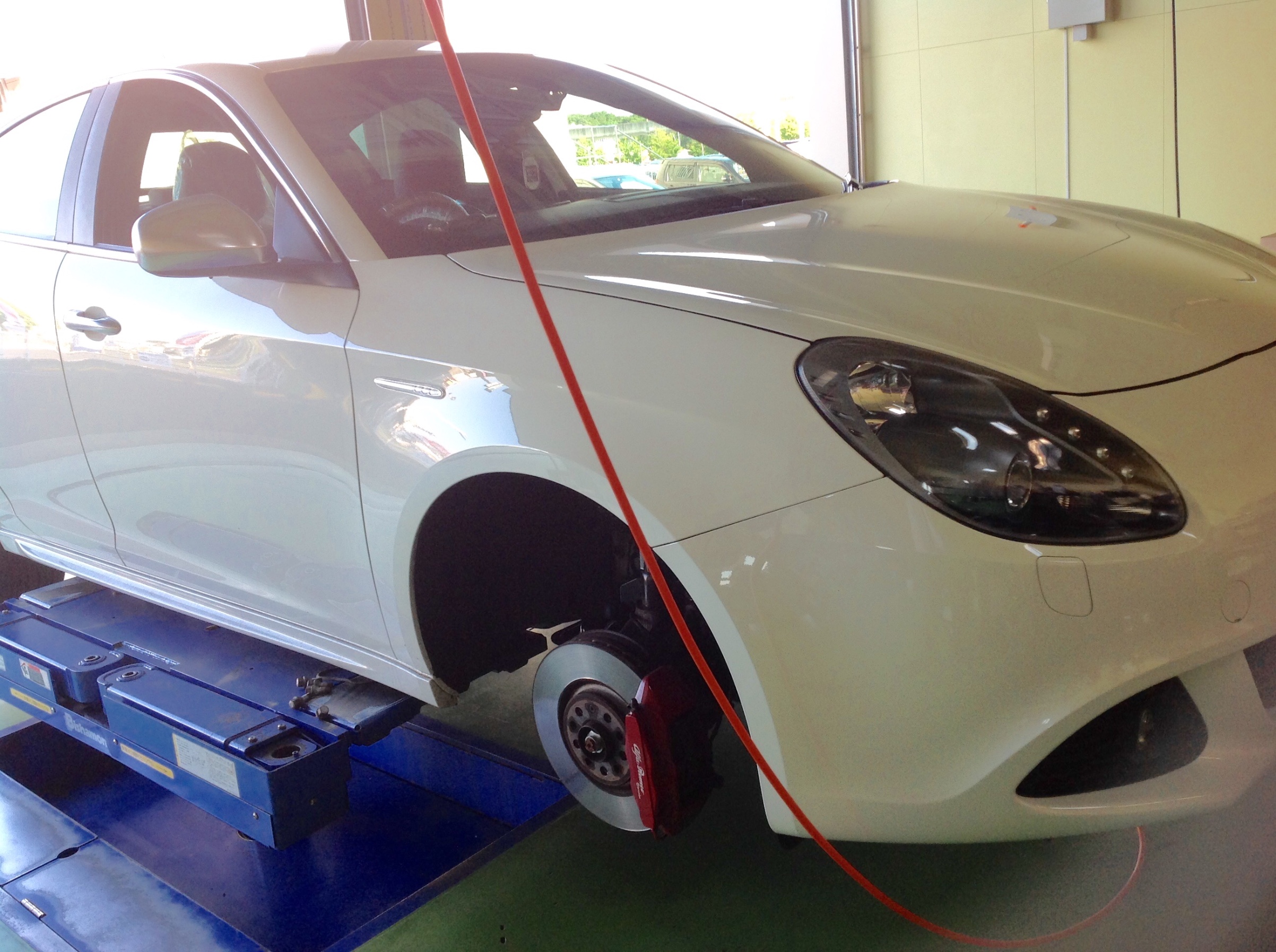 アルファロメオ ジュリエッタのフロントタイヤ交換とホイールアライメント調整を作業させていただきました