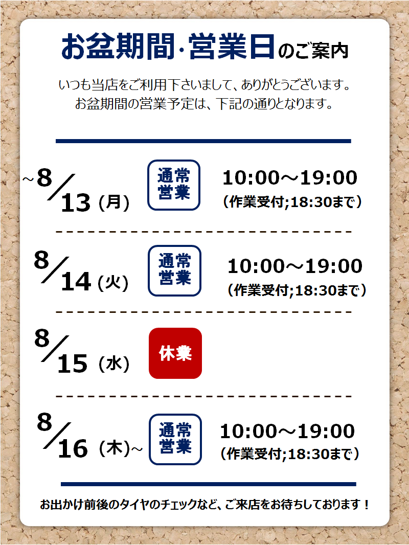 お出かけ前のタイヤチェックなど、皆さまのご来店をお待ちしております。