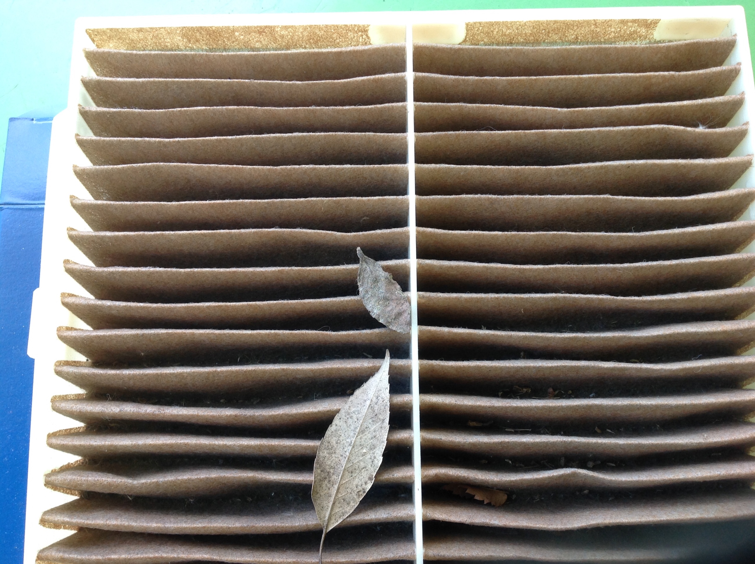 これはエアコンフィルターを交換した車両から外したものになりますが、枯葉や埃がかなり付いてますね