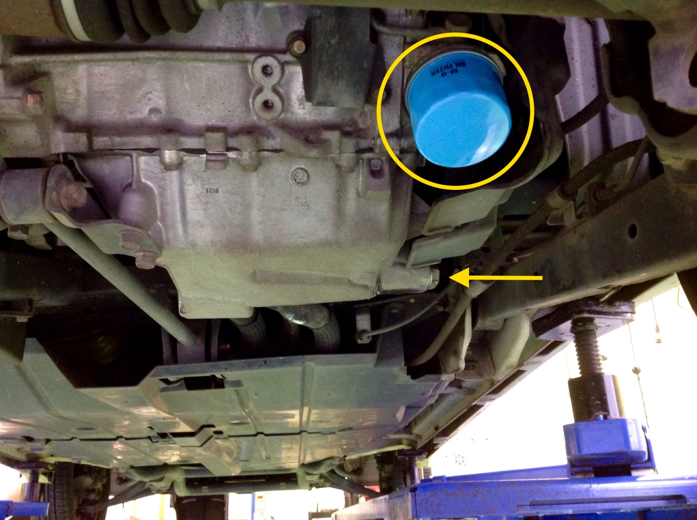 矢印のところがドレンボルトで、○印がオイルフィルターになります。