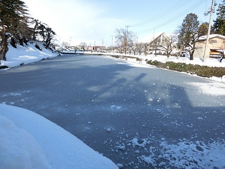 周囲を囲む水堀が凍ってしまっていました。