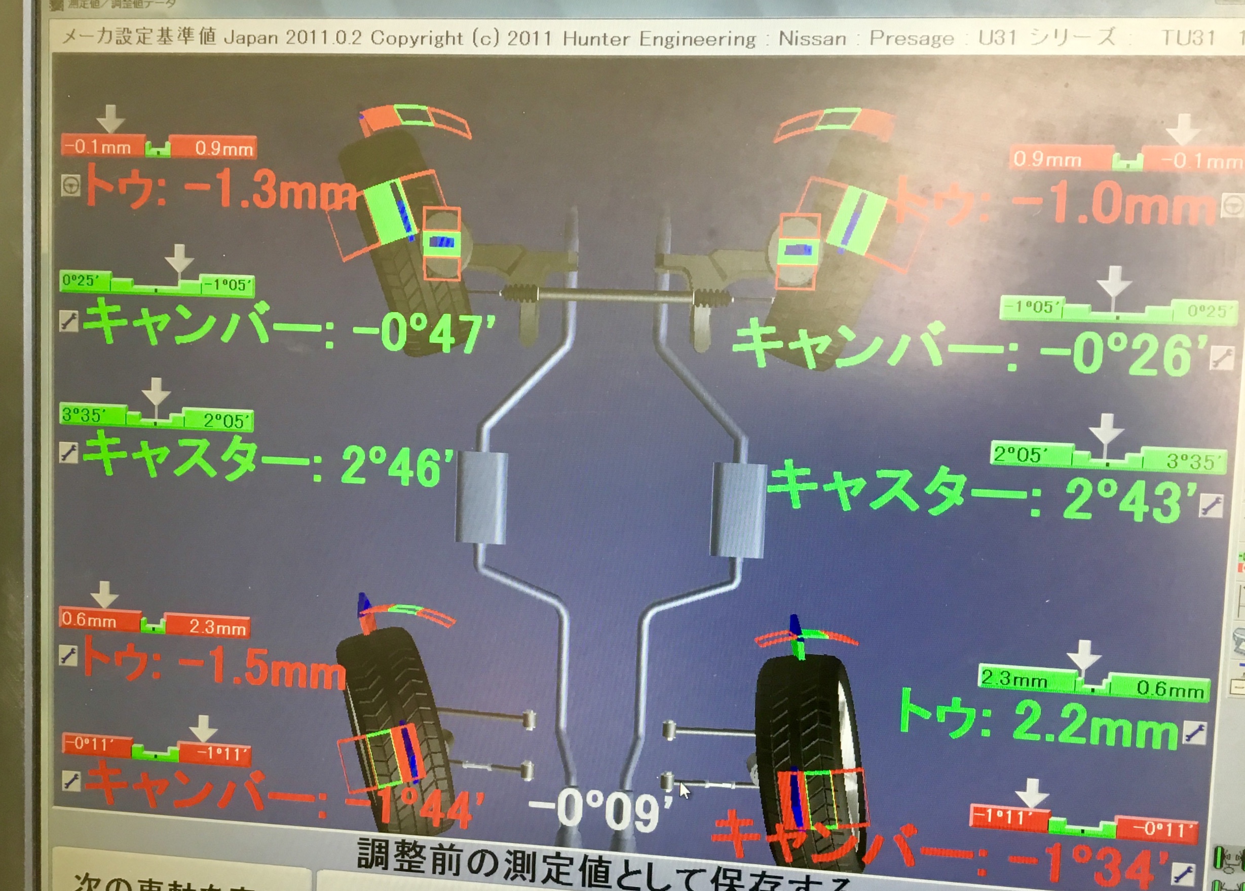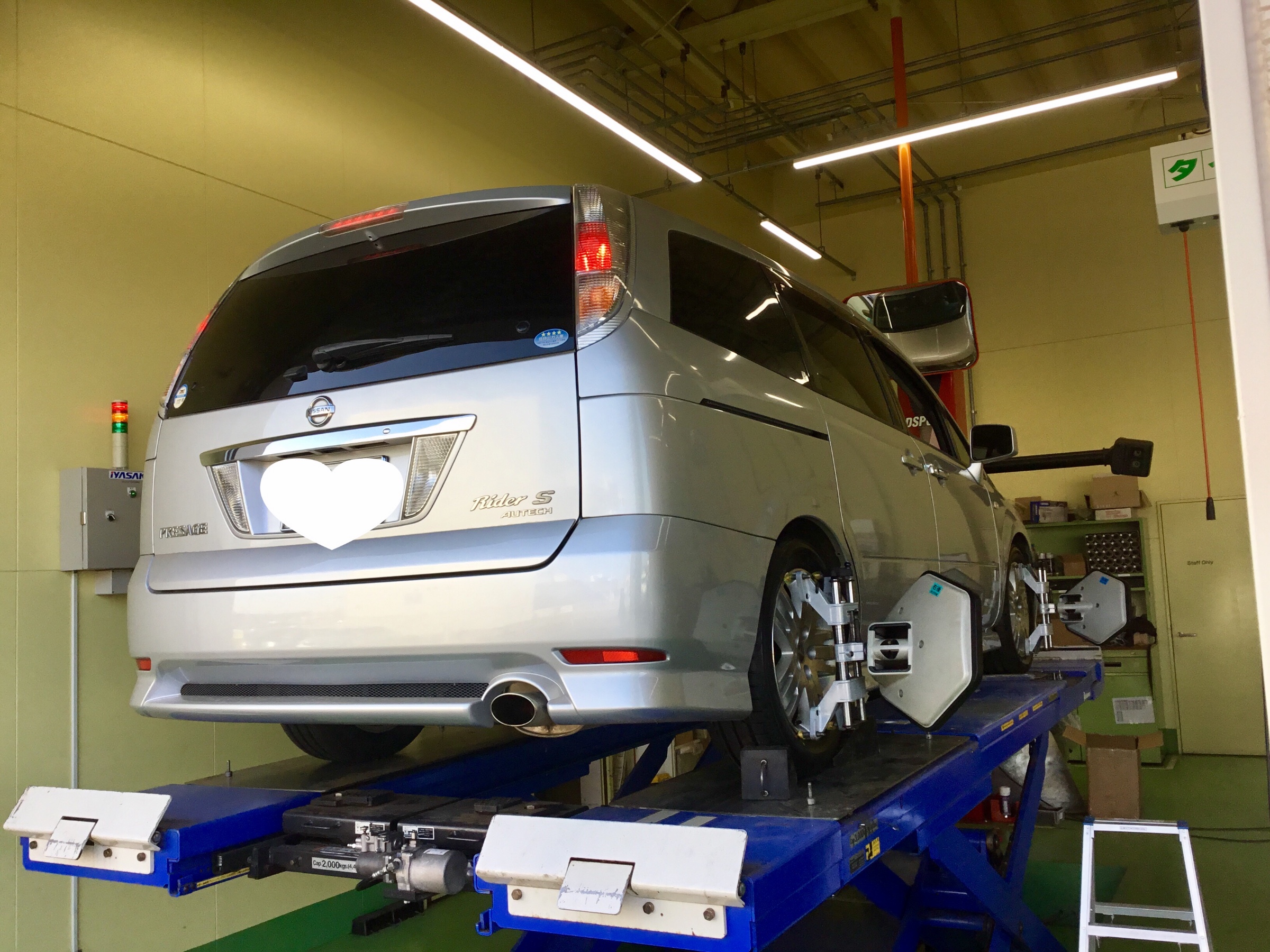 日産 プレサージュ(U31型)のタイヤ交換とホイールアライメント調整を作業させていただきました。