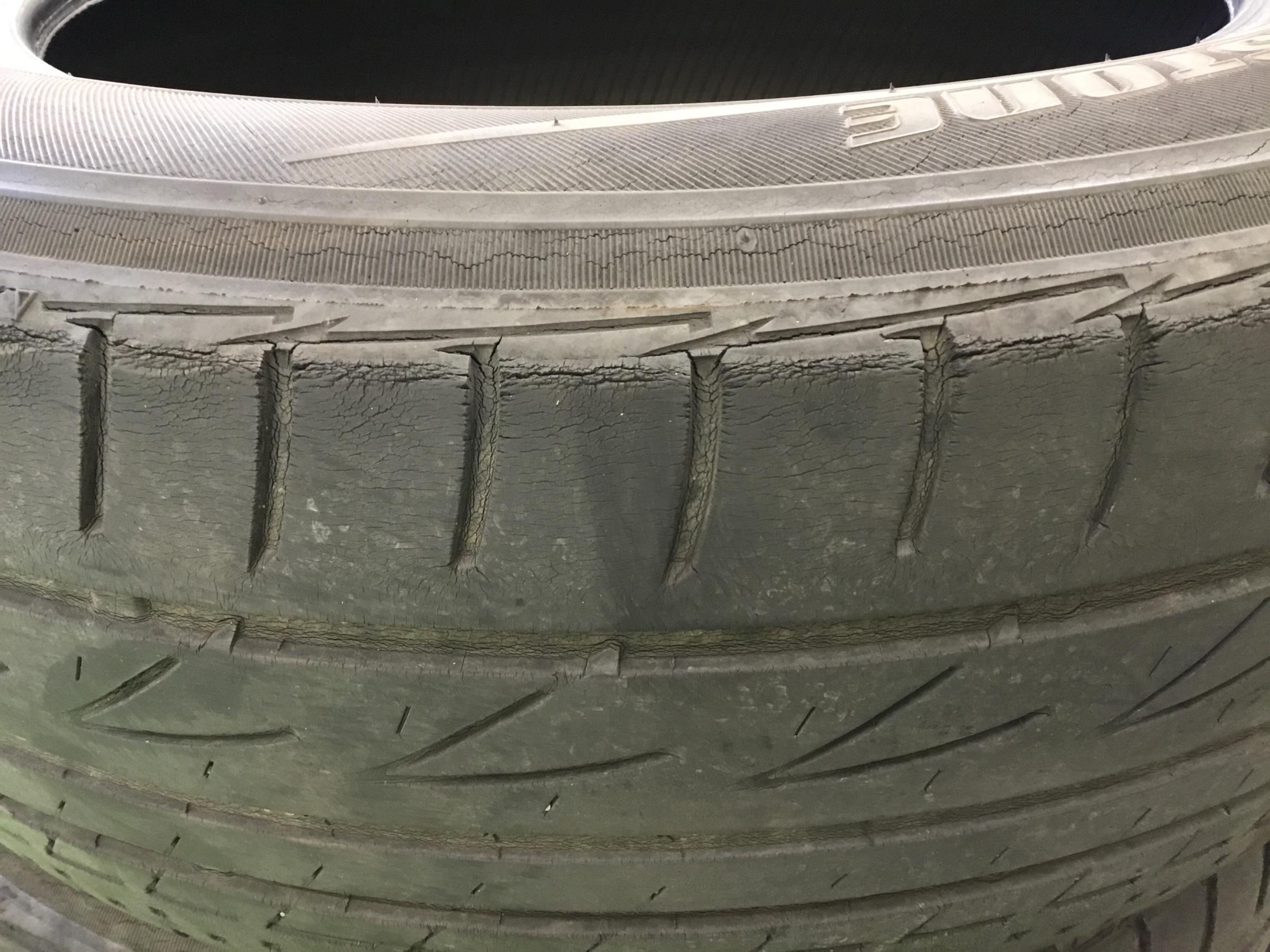 外したタイヤはスリップサインは出ていませんでしたが、ヒビ割れが酷い状態でしたので交換させていただきました。