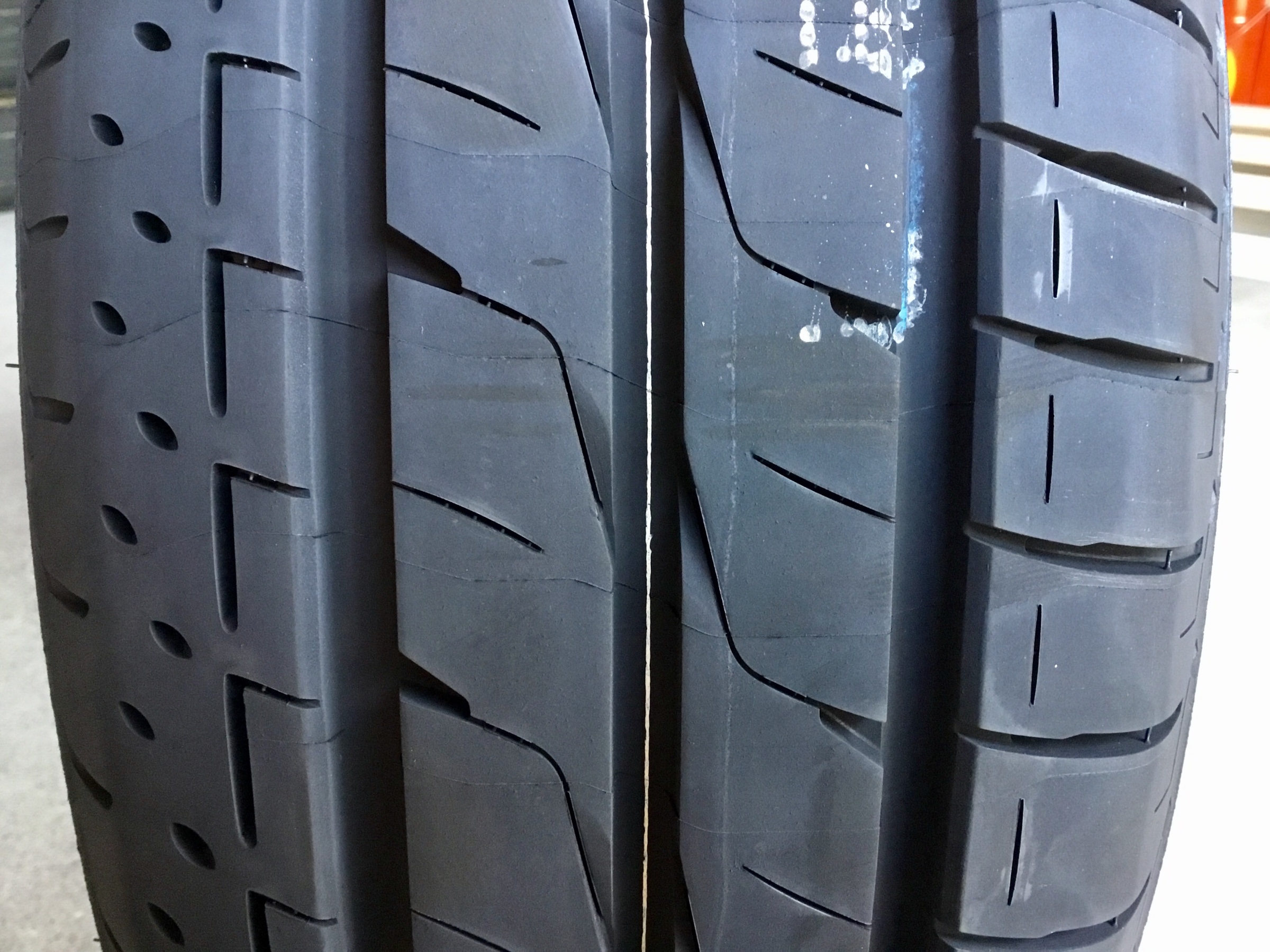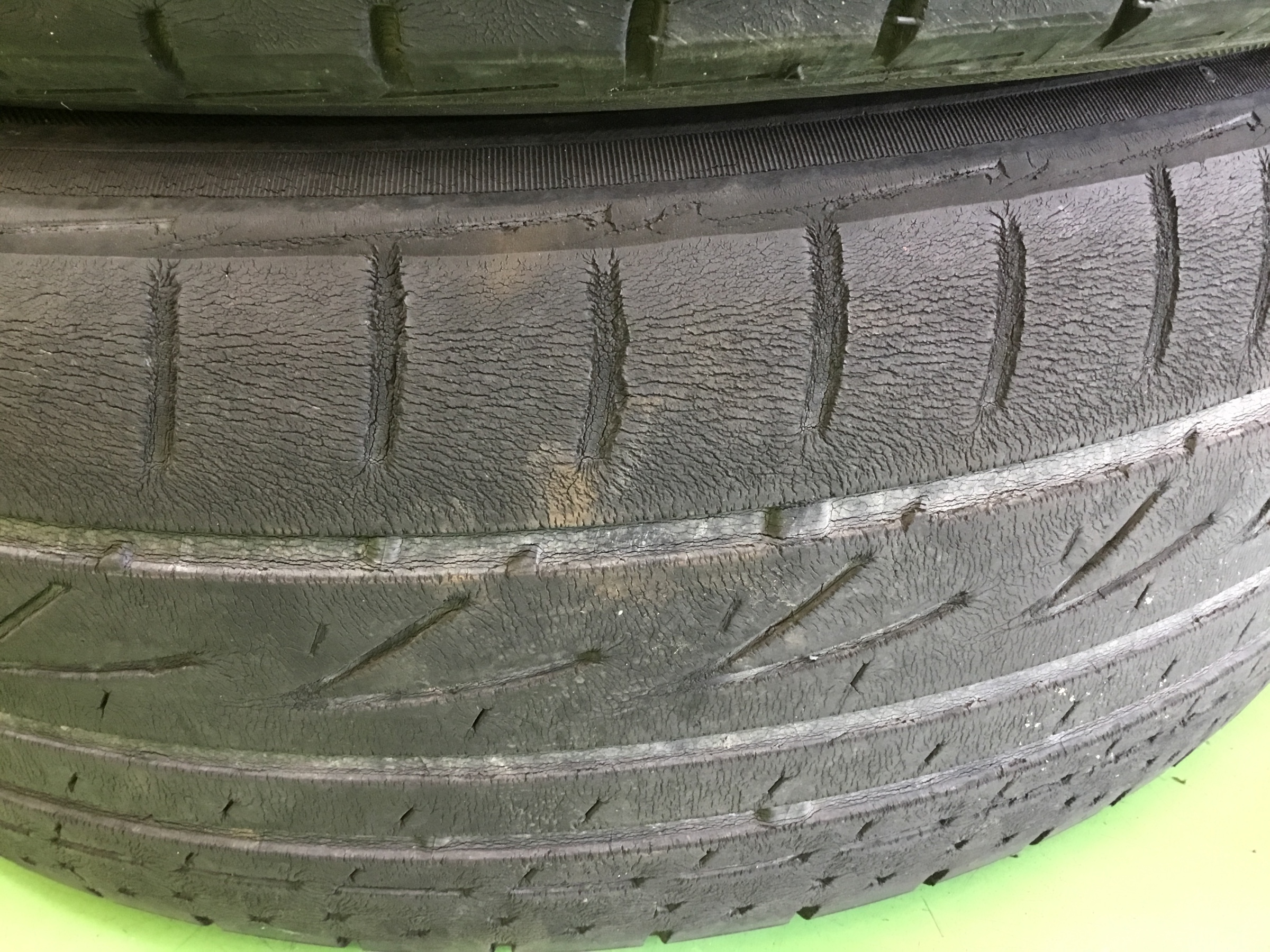 こちらは元々装着されていたタイヤですが、全体的にヒビ割れが酷く、残り溝の限界を示すスリップサインまでギリギリといったところでしたの交換させていただきました。