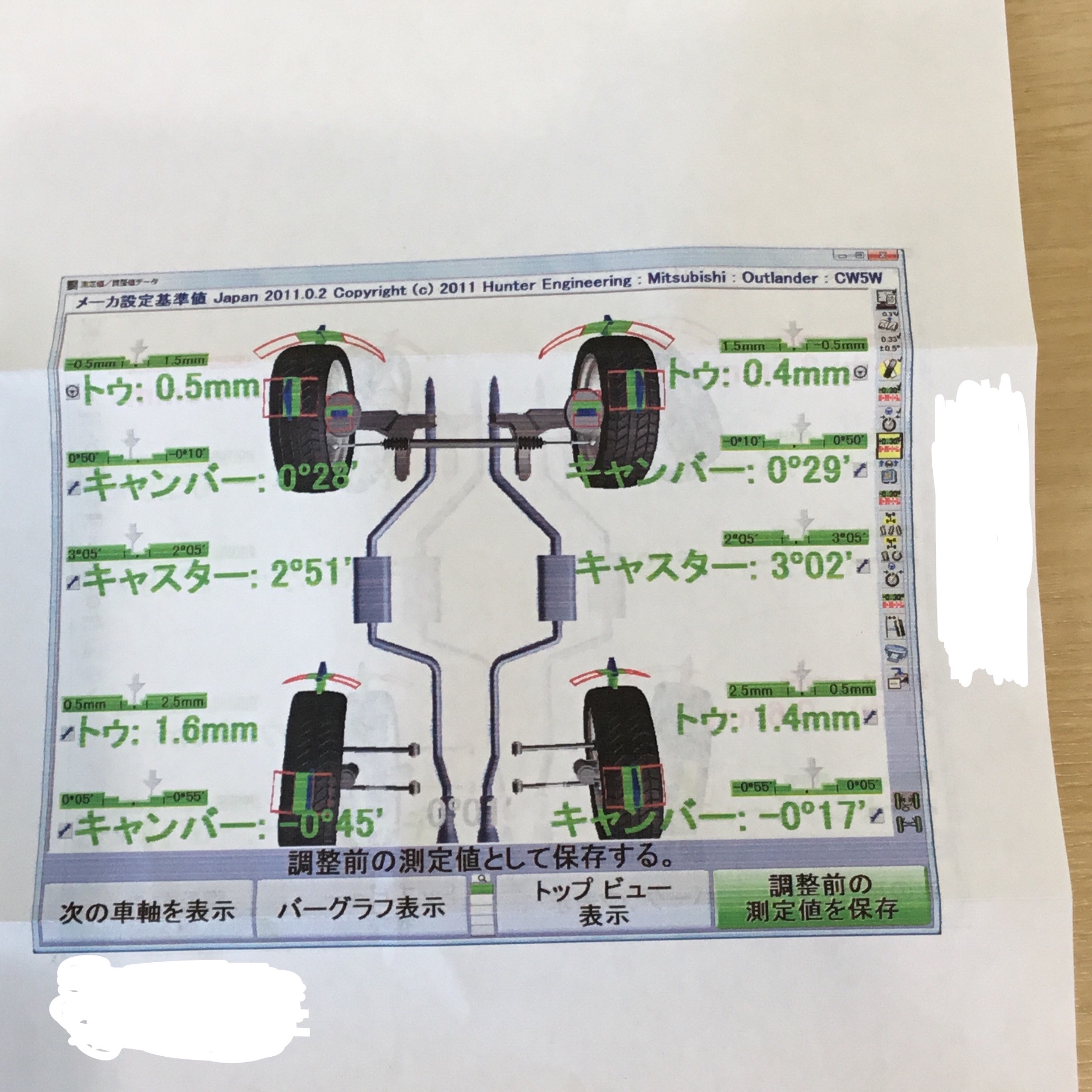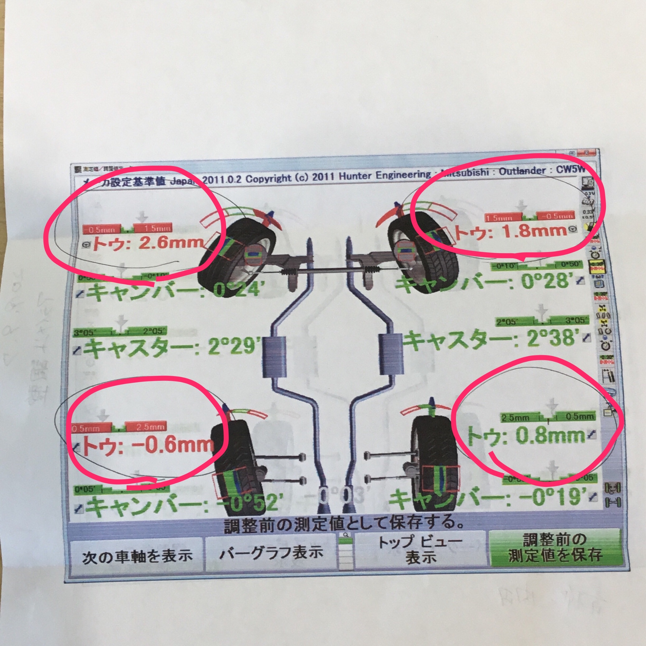 アウトランダーのアライメント測定をした時に前のトウの部分が内側によっていたのを調整させていただきました。