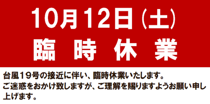 台風19号の接近に伴い、誠に勝手ながら