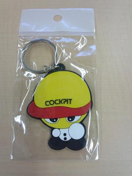 こちらのキーホルダー、キャラクターの帽子にブリヂストンのタイヤショップ『COCKPIT』の名前が入っております。