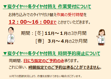 お持込みでのタイヤお履き替え作業受付時間につきまして、ご案内いたします。