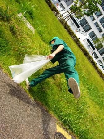 すごい体勢で、ゴミを拾うよしいをパチリ☆