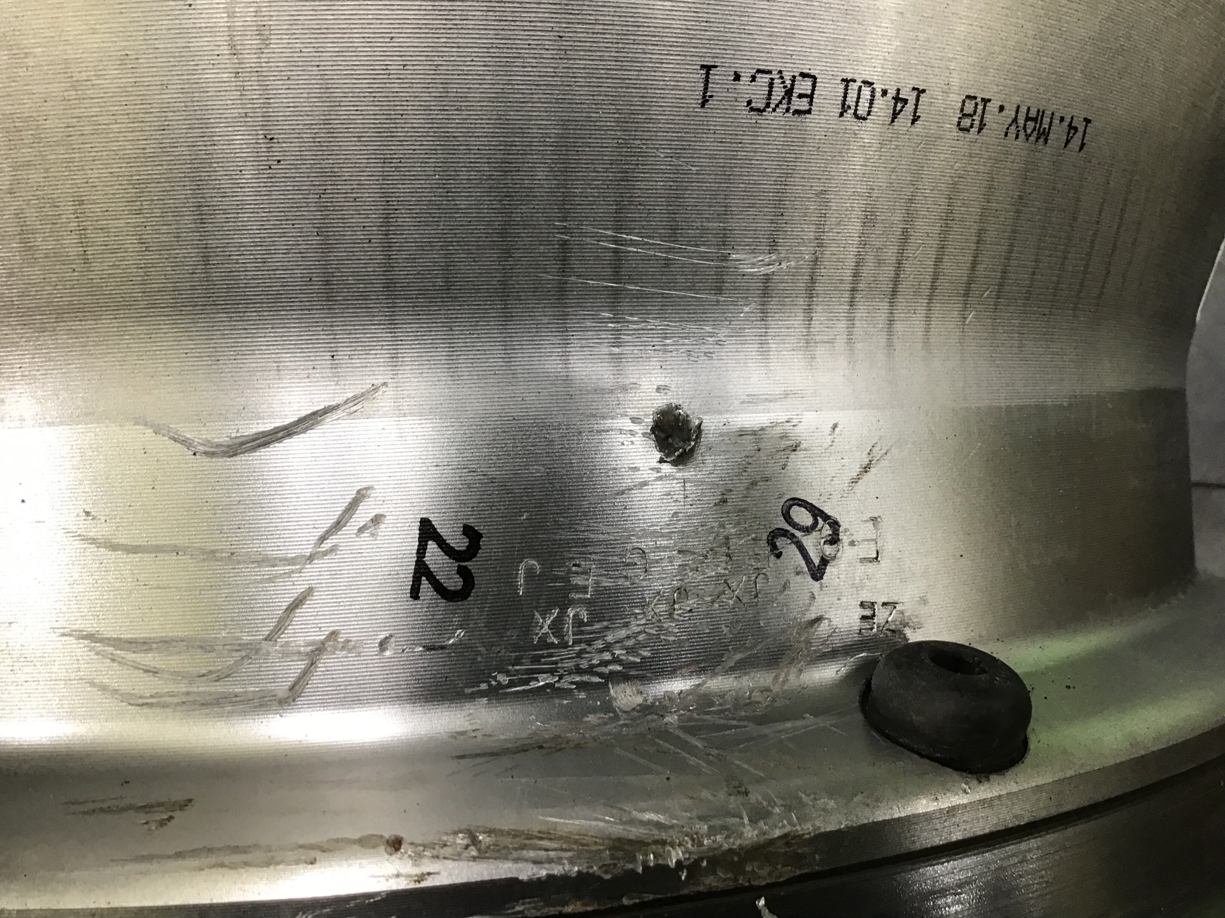 2枚目のホイールの写真は、とても大きい釘がタイヤに刺さった衝撃でホイールまで貫通してしまいましたって感じです。これはホイールも使い物になりません。