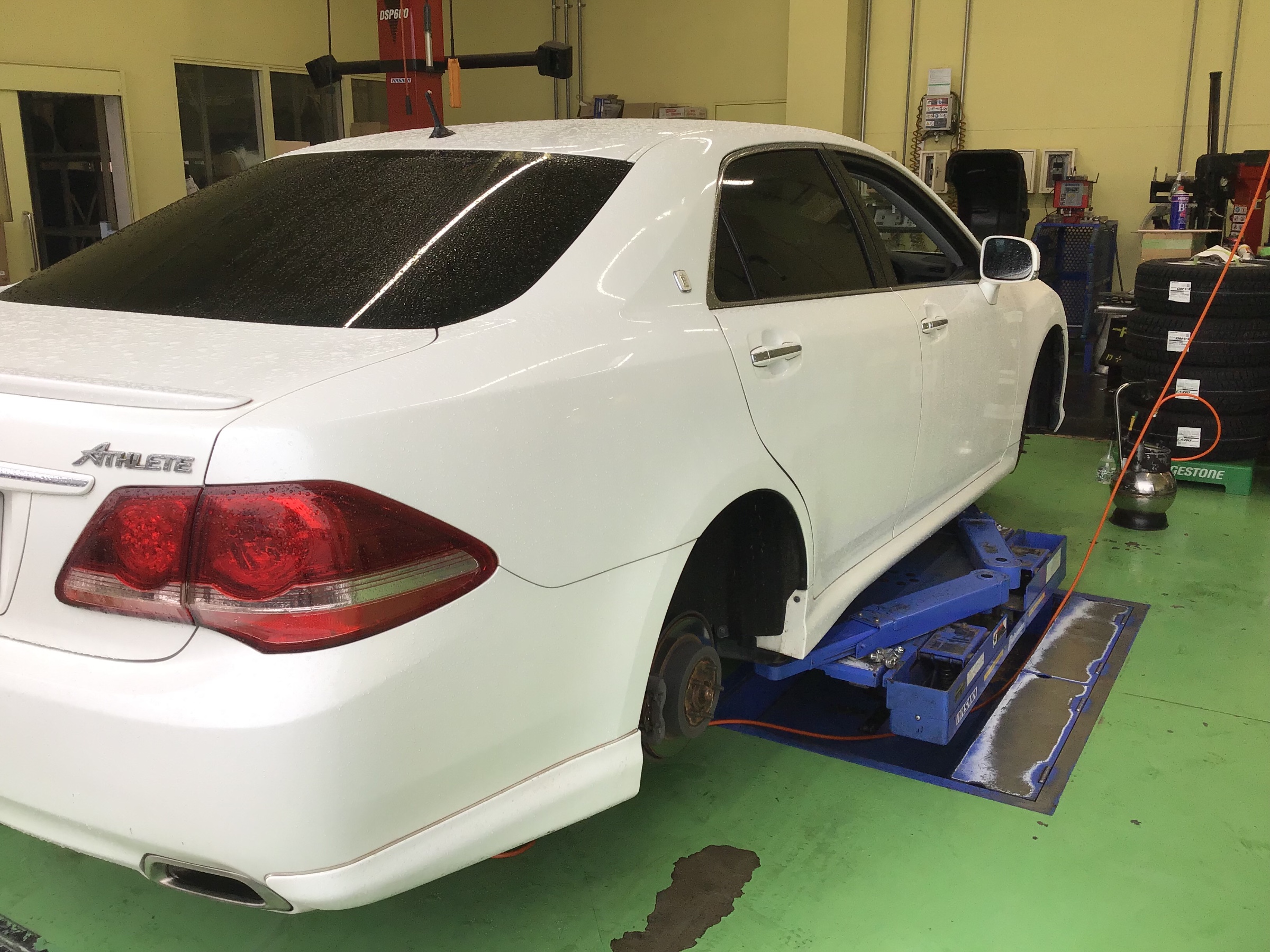 こちらのお車は、車高が低いためリフトであげてしまうとサイドステップが割れてしまうためアームといったものを使ってあげていきます!