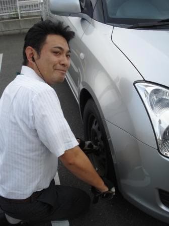 タイヤ専門店として、タイヤお買上げの後に行っている『100km点検』をしている野村GM発見!!