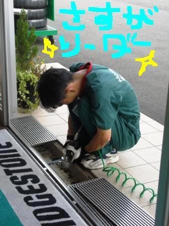 写真のリーダ川上、入口の自動ドア下辺を削っております。当店の自動ドアは雨が吹きつけると、雨水が店内に侵入し水浸しになってしまうので(!)、水はけが良くなるよう水路を作ってもらっている最中です(^^ゞ