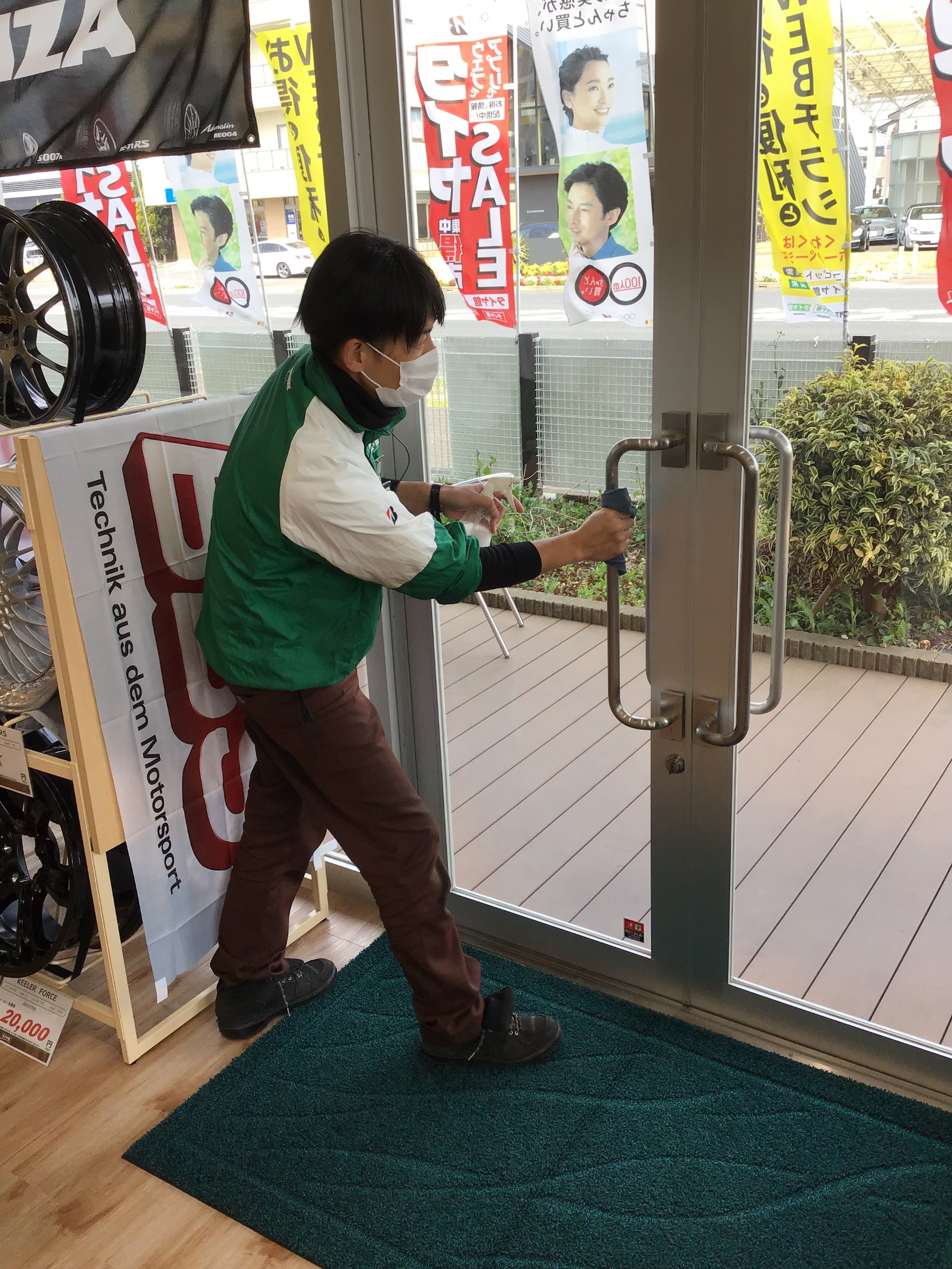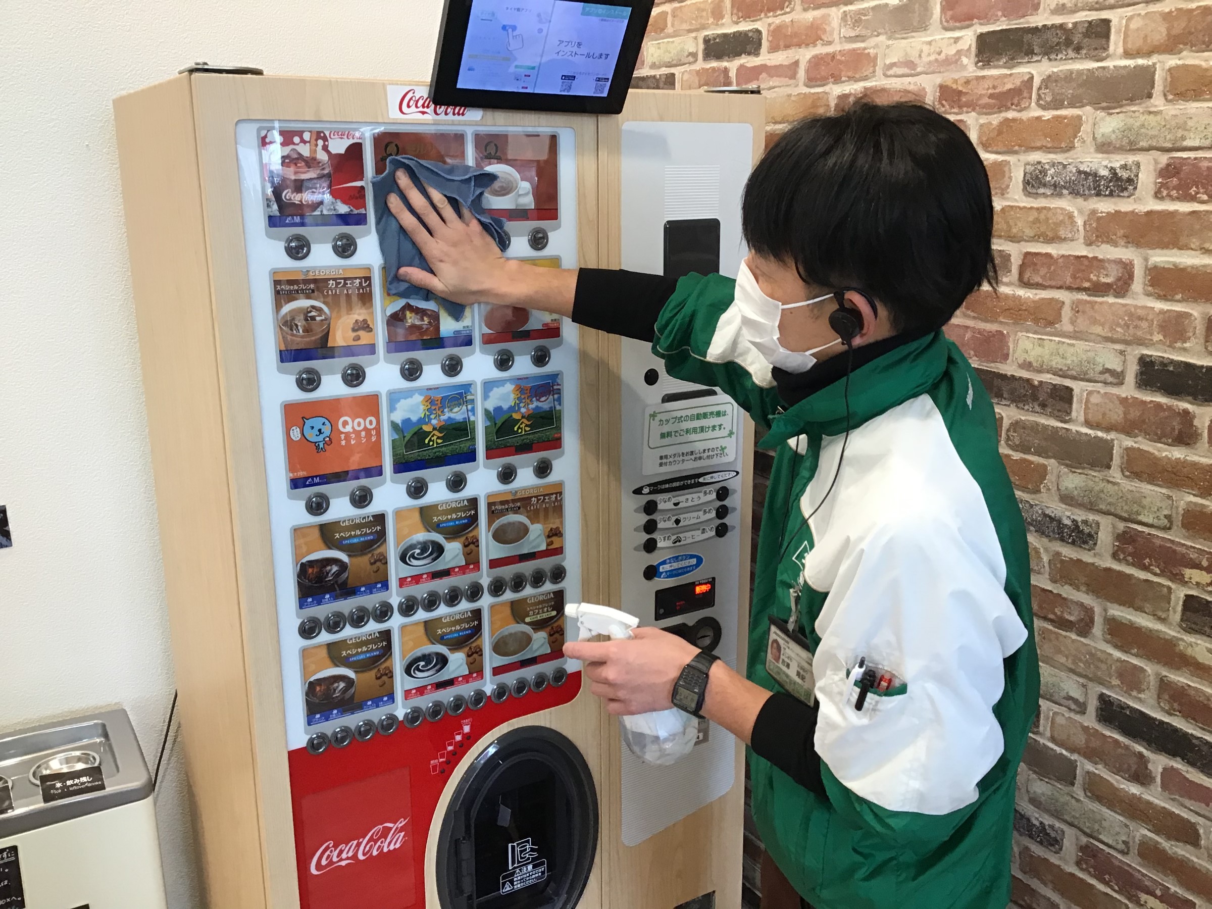 店舗入口の取っ手やテーブル、自動販売機等を定期的に除菌しております。