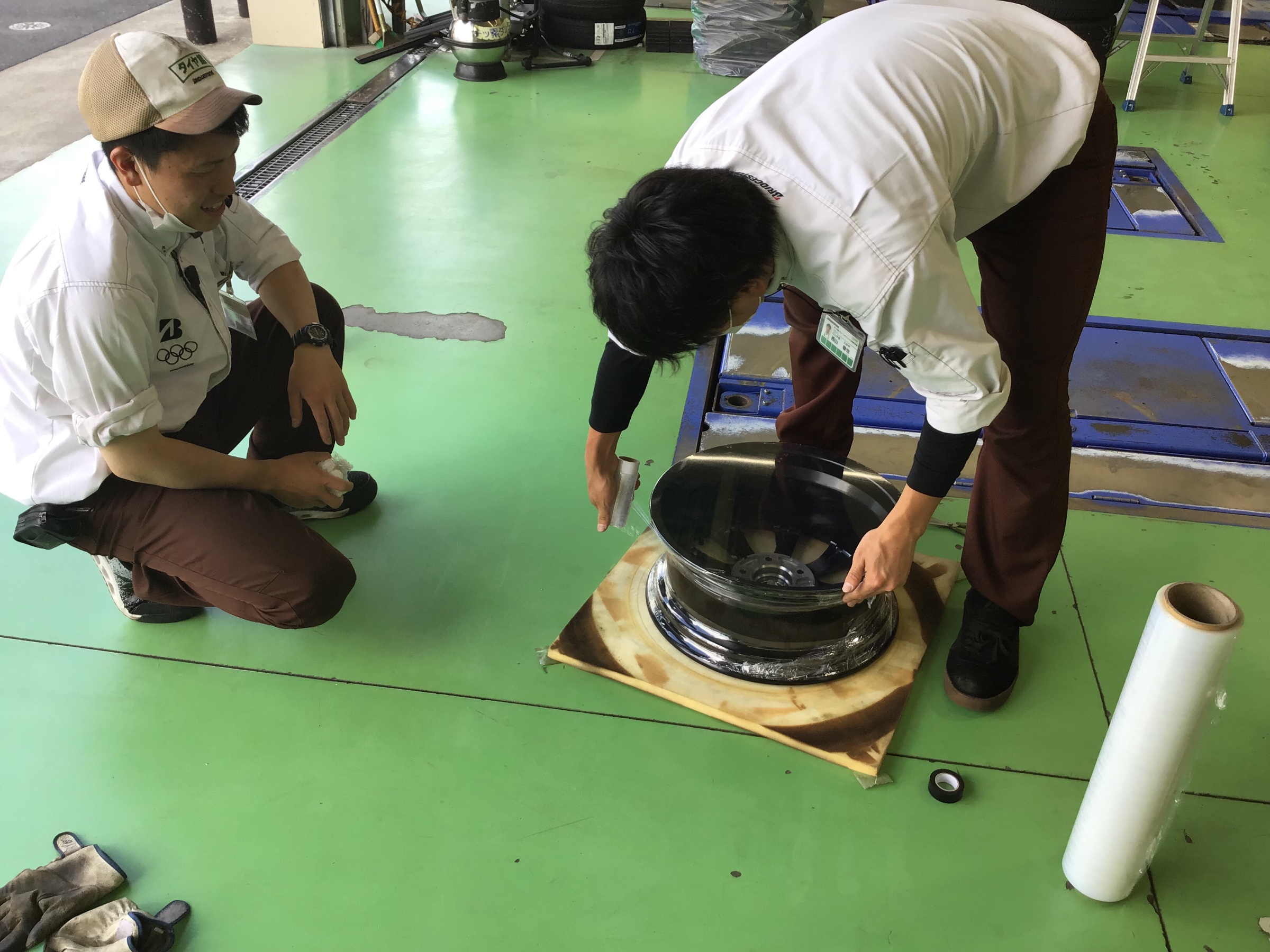 展示用ホイールに汚れ防止のラップを巻いているようですね^_^