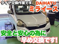 皆さん、こんにちは(・∀・) お店も3連休を頂いておりましたが 本日も元気に営業しております! さて本日DAIHATU ミライースの タイヤ交換作業のご紹介です(´∀`) ミゾはそこまで摩耗していませんでしたが ヒビ割れ、劣化は進行しており 安全と安心の為にお早目の交換なりました。 早速、新しいタイヤ...