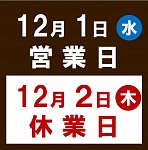 いつも当店をご利用いただきまして、誠にありがとうございます。 当店は毎週水曜日を定休とさせていただいておりますが、 今週は ▼ 12月1日(水)が営業日 ▼ 12月2日(木)が休業日 となります。 ご不便をおかけいたしますが、何卒ご理解賜りますようお願い申し上げます。