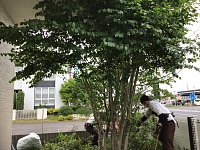 いつの間にか伸びに伸びた草木たち。 連日、ご予約の作業の合間にきれい好きの男性スタッフが 交代で木々の剪定作業や草むしりをしていました。 店舗の看板や壁をものともせず枝を伸ばし続ける木々。 10年を超える月日は、こんなにも植物を成長させるのですね。 「えっ!いつもは切ったりしないのに...